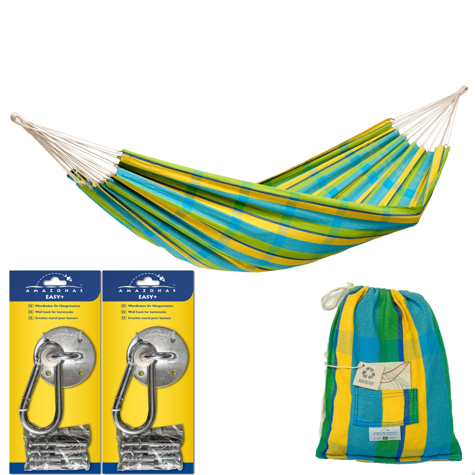 The Easyplus includes carabiners, screws, and nylon screw plugs. The supplied screws are designed for masonry and wood. Use the plugs when mounting your hammock/chair into masonry.