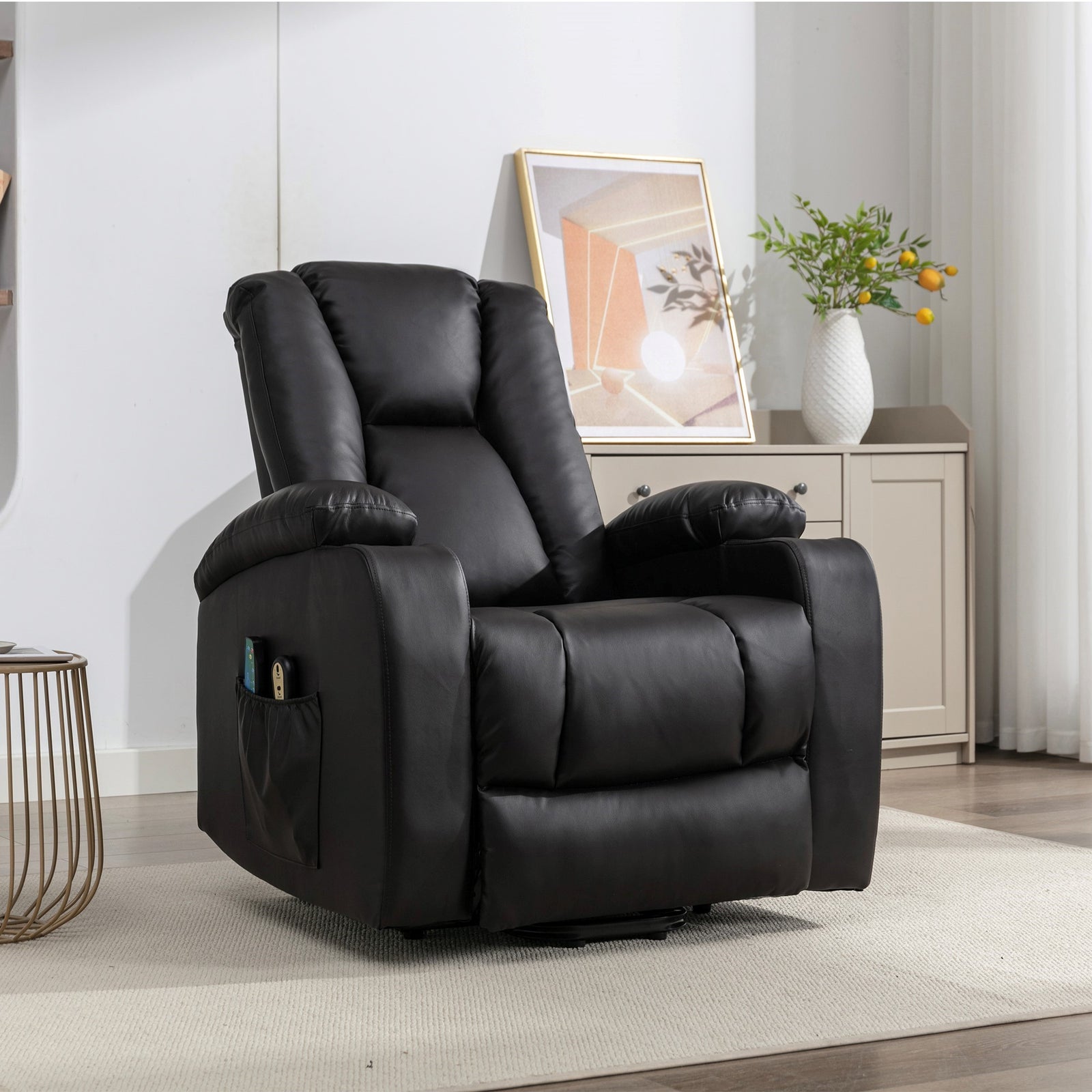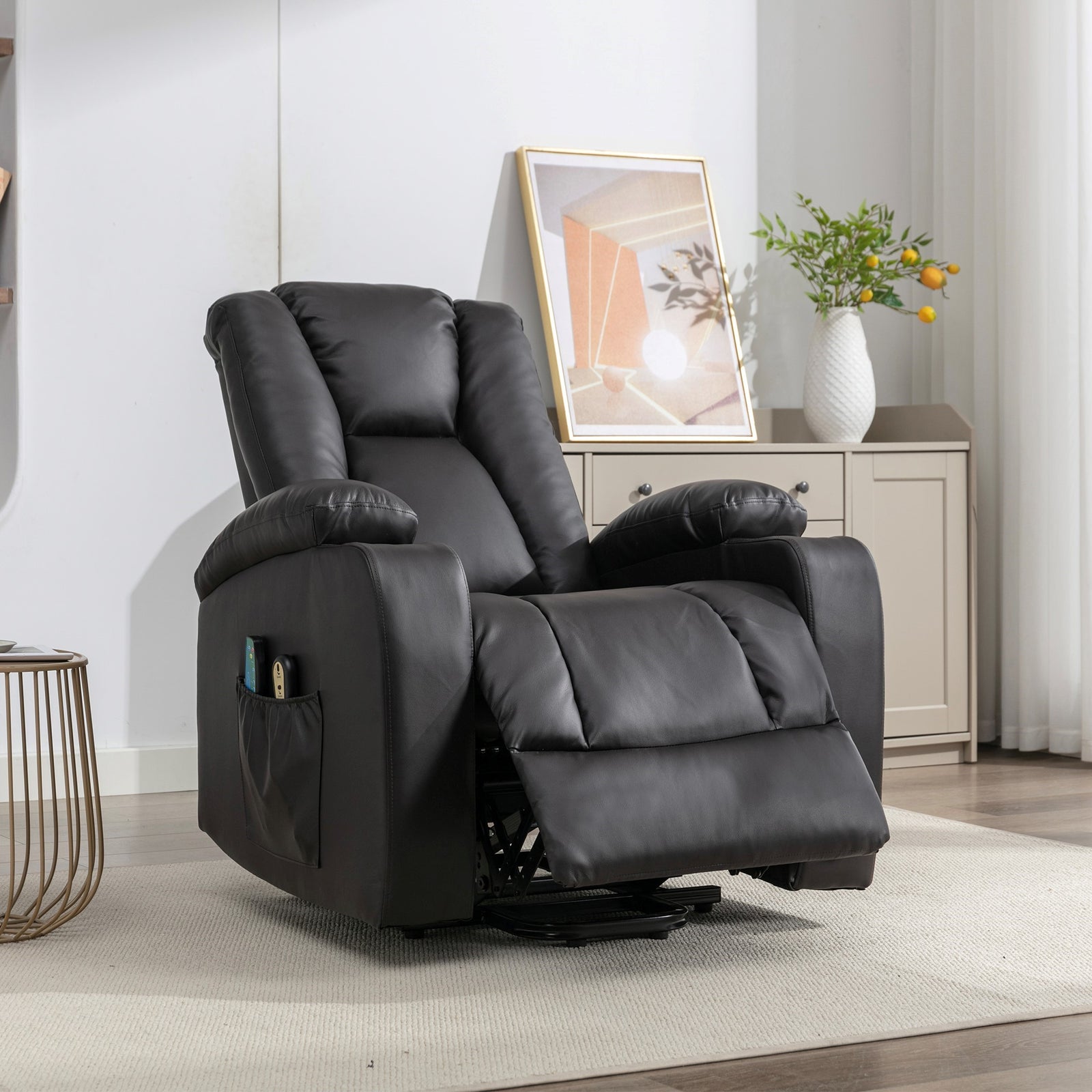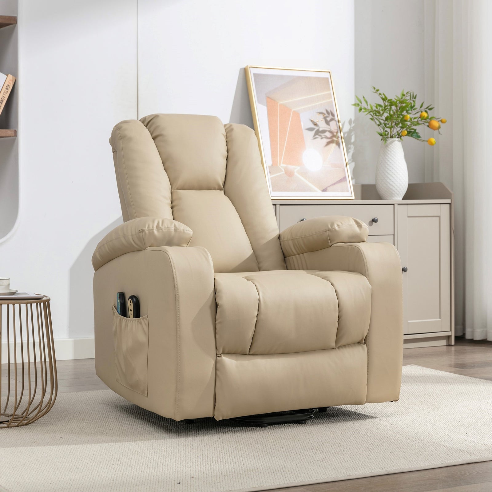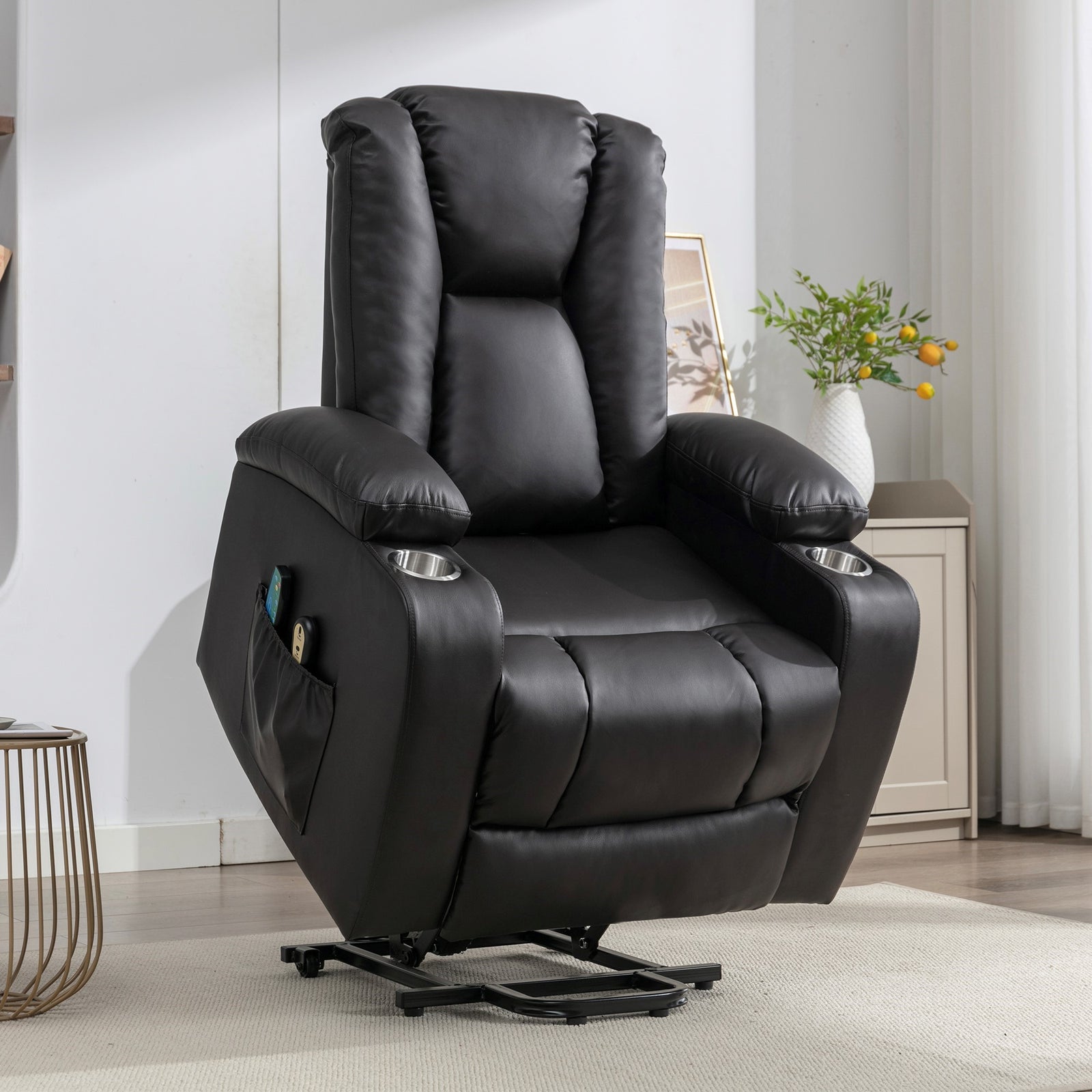 Experience the pinnacle of relaxation and comfort with the hartville electric lift assist riser recliner chair. Crafted with bonded leather upholstery, this chair exudes timeless elegance. Its coil-sprung and foam-filled interior ensure unmatched support and cushioning, while the narrow back design adds a sleek touch to any space. Our two-man delivery and assembly service ensures a hassle-free setup. The built-in cup holder in the armrests keeps your beverages within reach, while massage points in the seat, lower, and upper back offer soothing relief. Additionally, the warming heat function in the lumbar area provides an extra layer of coziness. Elevate your relaxation game with the hartville, where style meets functionality for the ultimate sitting experience.