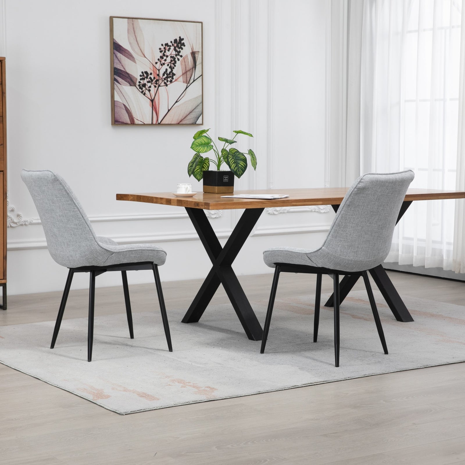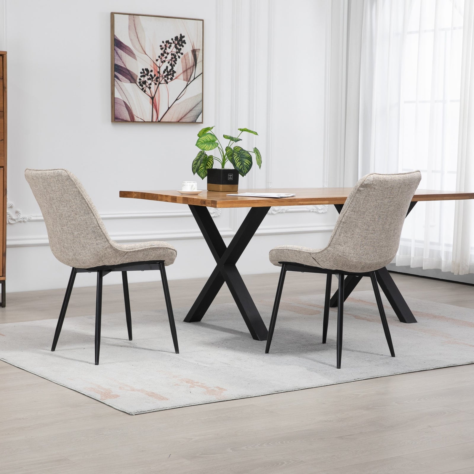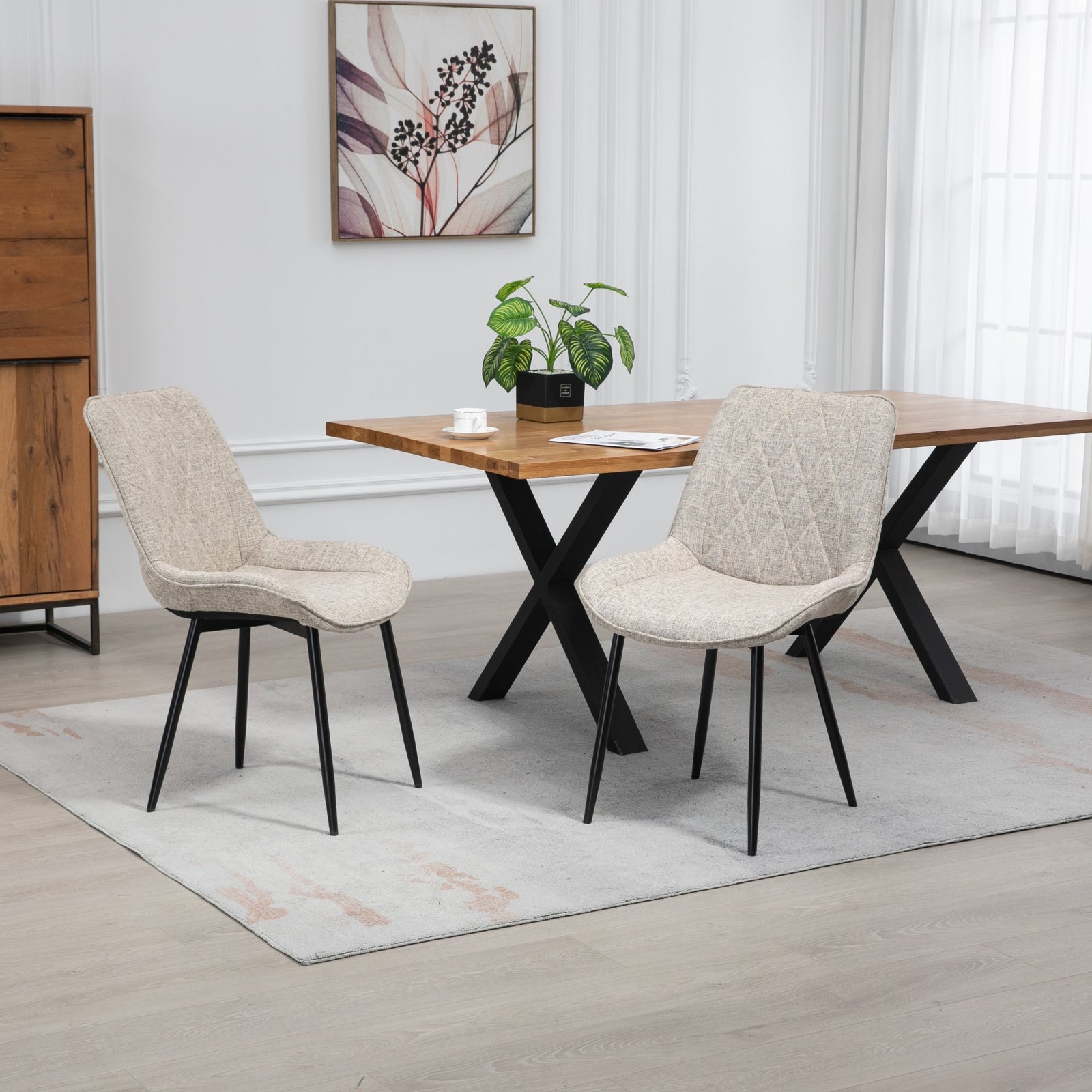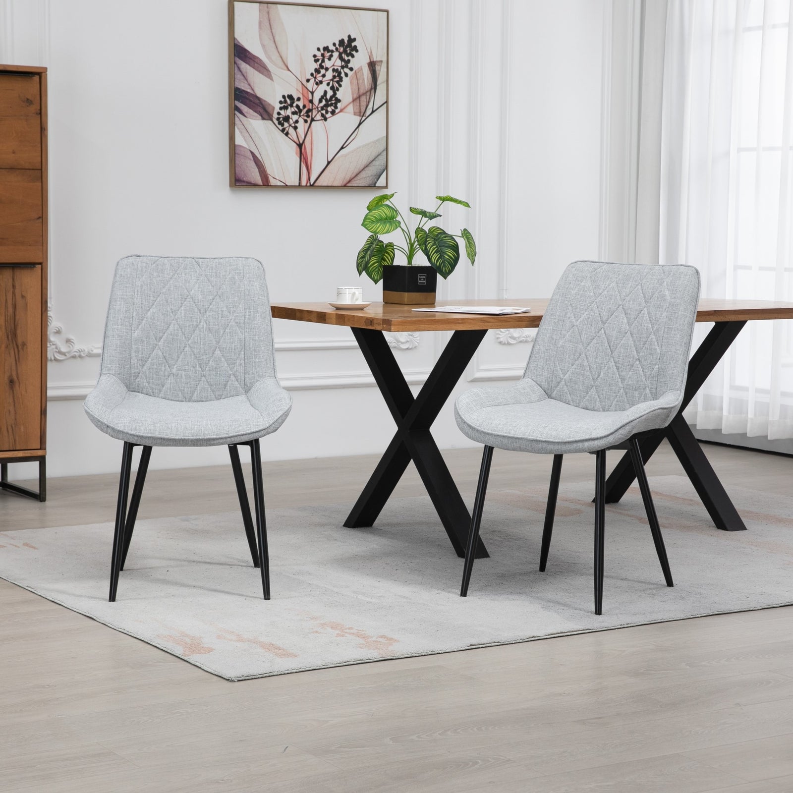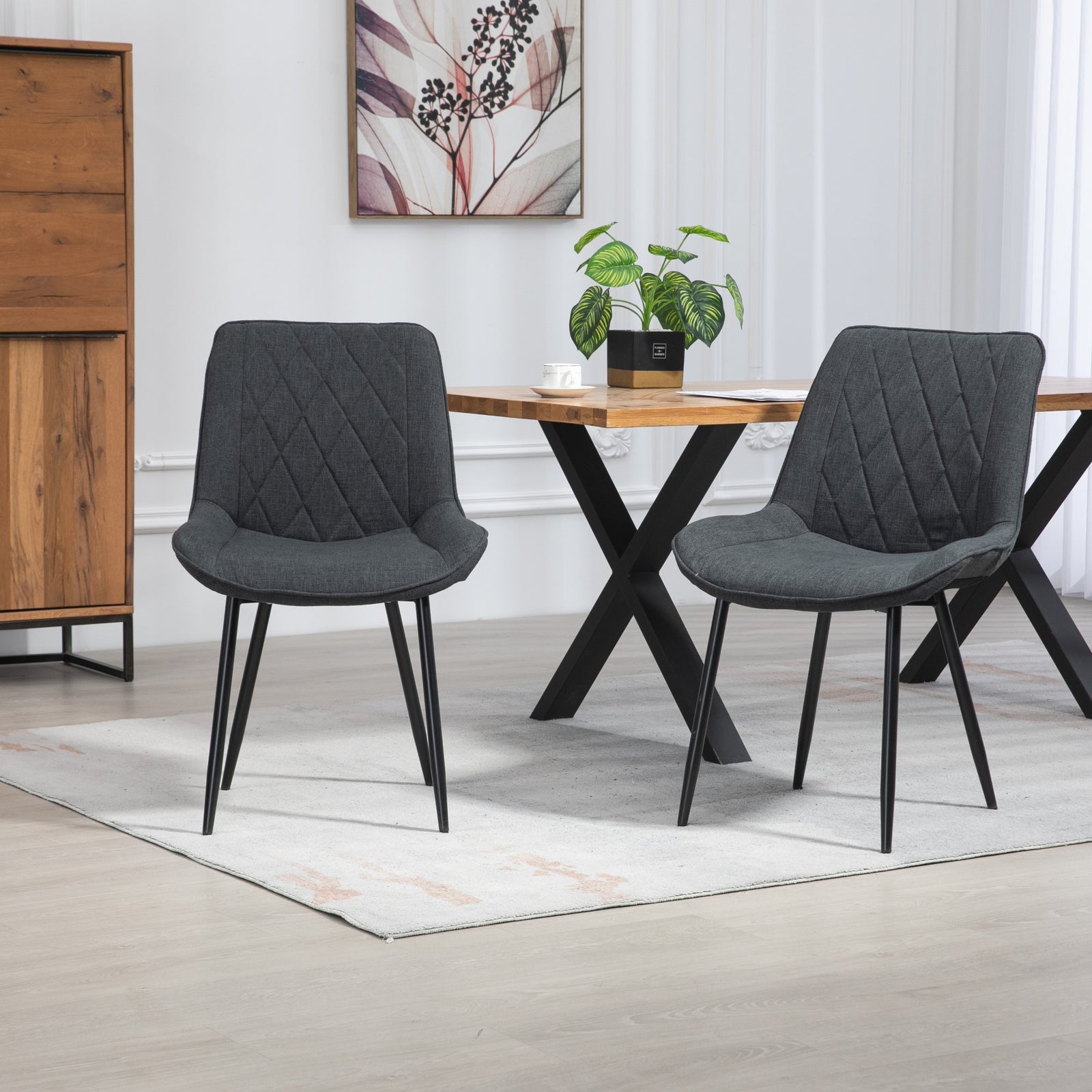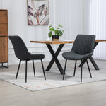 Introducing the epitome of sophistication and comfort in dining furniture - the bovino range dining chairs. Elevate your dining experience with this exquisite pair of chairs that seamlessly blends style and functionality. Crafted with meticulous attention to detail, these chairs are designed to add a touch of elegance to your dining space.wrapped in luxurious textured fabric upholstery, the chairs offer a sumptuous feel that invites you to linger at the table. The wide, spacious seat ensures optimal comfort during long dinners and lively conversations, creating an inviting atmosphere for family and friends. The diamond patterned back not only adds a modern flair but also provides excellent lumbar support, making these chairs a perfect choice for both style and ergonomics.the robust wooden frame guarantees durability and longevity, promising years of reliable use. Complemented by dark metal legs, the bovino range dining chairs strike a perfect balance between sturdiness and contemporary design. The dark metal legs not only enhance the chairs' stability but also contribute to a sleek and modern aesthetic that complements various interior styles.choose from a palette of multiple colours to match your personal taste and existing decor seamlessly. Whether you prefer timeless neutrals, bold statement hues, or anything in between, the bovino range has a colour option to suit every preference. These chairs are not just functional, they are a design statement that effortlessly enhances the visual appeal of your dining area.experience the convenience of quick and efficient delivery, ensuring that you can enjoy your new bovino range dining chairs in no time. Transform your dining space into a haven of style and comfort with these thoughtfully crafted chairs that redefine the art of dining furniture. Elevate your home with the perfect combination of form and function, courtesy of the bovino range dining chairs.