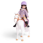 Lottie Doll loves riding her trusty white Welsh pony, Shelby. Lottie is suitably dressed for a day filled with equestrian adventures. She wears a tweed jacket, white shirt, riding trousers, and black boots.