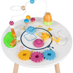 this comprehensive wooden activity table encourages discovery through play, developing tots’ co-ordination, fine motor skills and dexterity. Four sturdy table legs ensure it can withstand many enthusiastic play sessions. Suitable for 12+ months.