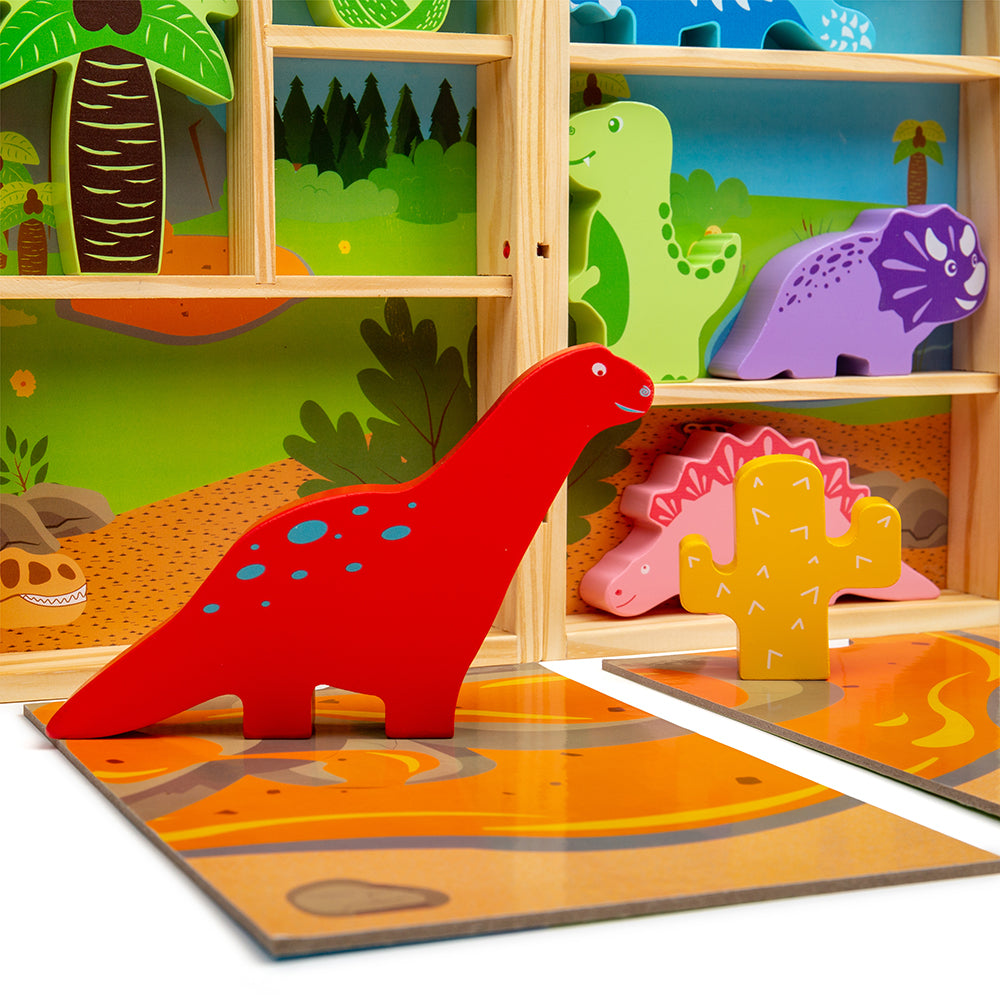 Packed with plenty of play value, our dinosaur play box introduces kids to a jurassic world of friendly dinos. This fun kids activity set features chunky wooden dinosaurs such as a t-rex, diplodocus, stegosaurus, triceratops and ankylosaurus as well as exotic play pieces such as a cactus, aloe vera and palm tree.