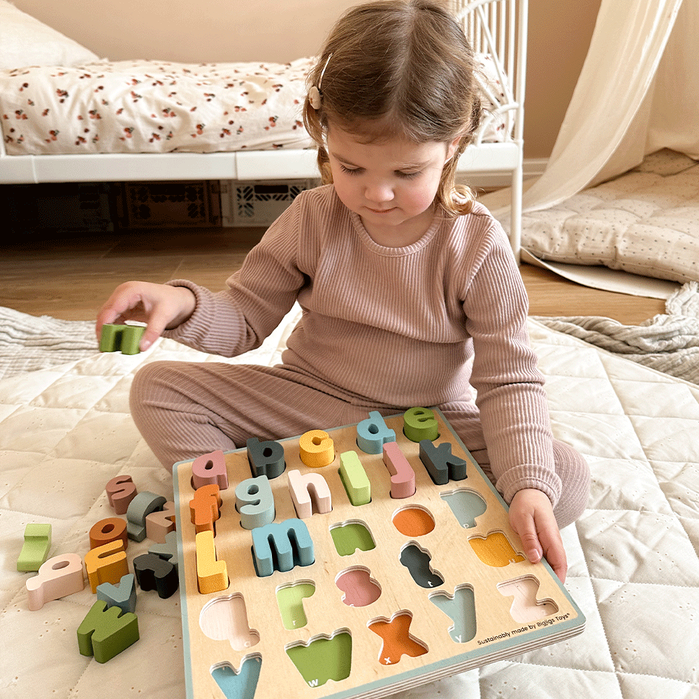 Learning about letters and words is as easy as abc with our fsc® certified wooden alphabet puzzle. Each pastel coloured lowercase letter is colour-coordinated with its base slot to help develop recall and recognition skills. The chunky wooden puzzle pieces are perfectly sized for little hands.