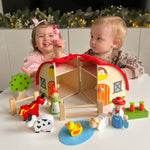 "old macdonald had a farm, e-i-e-i-o!" our mini farm toys playset is packed full of colourful wooden animals and farm figures. Open up the playset to reveal mr and mrs farmer, a duck in a pond, a horse, a sheep, a cow, a chicken, a pig, carrots, fences and trees.