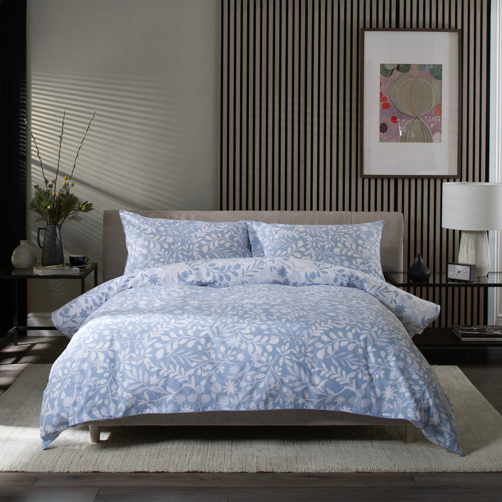 Refresh your space with the timeless charm of the deyongs 1846 white and pastel blue floral leaves duvet set. This reversible design offers two stunning looks in one, showcasing delicate floral leaves in soothing white and pastel blue tones—a perfect nod to nature’s serenity. Crafted from 100% soft cotton, this duvet set delivers exceptional comfort and breathability for a restful night’s sleep. The piped edging adds a refined touch, ensuring a finish as elegant as its design.