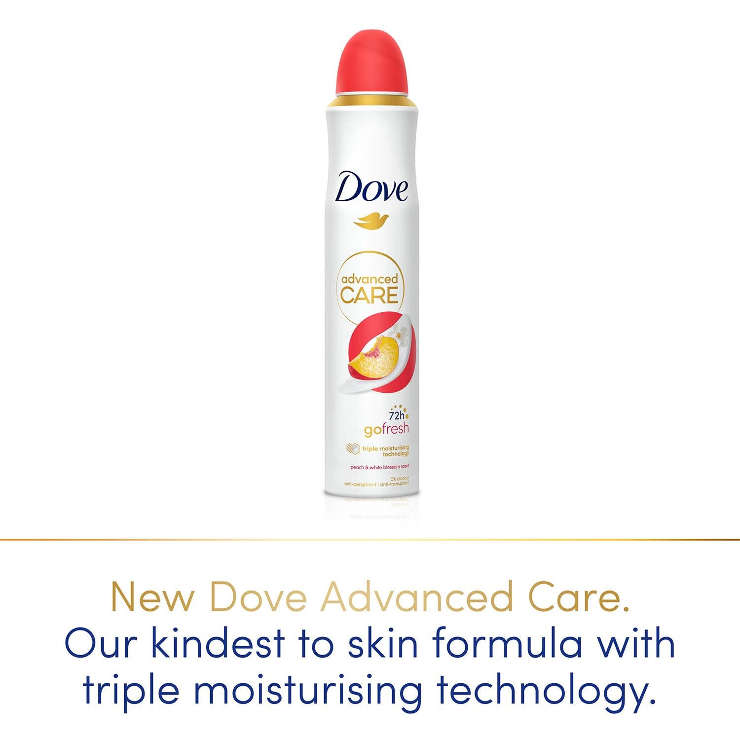 dove advanced care go fresh peach & white blossom anti-perspirant deodorant spray offers long-lasting anti-perspirant protection, underarm care and a refreshing scent