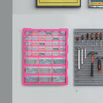 This 39 drawers storage cabinet is a perfect tool and parts organiser. For use in garage, repair-store, shed or workshop. Built with tough polypropylene for long-term durability. Drawers are transparent so you can easily see what's inside and find your tools quickly. And each drawer comes with a built-in stop to prevent anything falling out. It can be used as a free-standing cabinet or mounted on the wall. Slotted holes are drilled in the cabinet to facilitate wall mounting. A quick and easy way to organise small accessories with easy access.