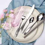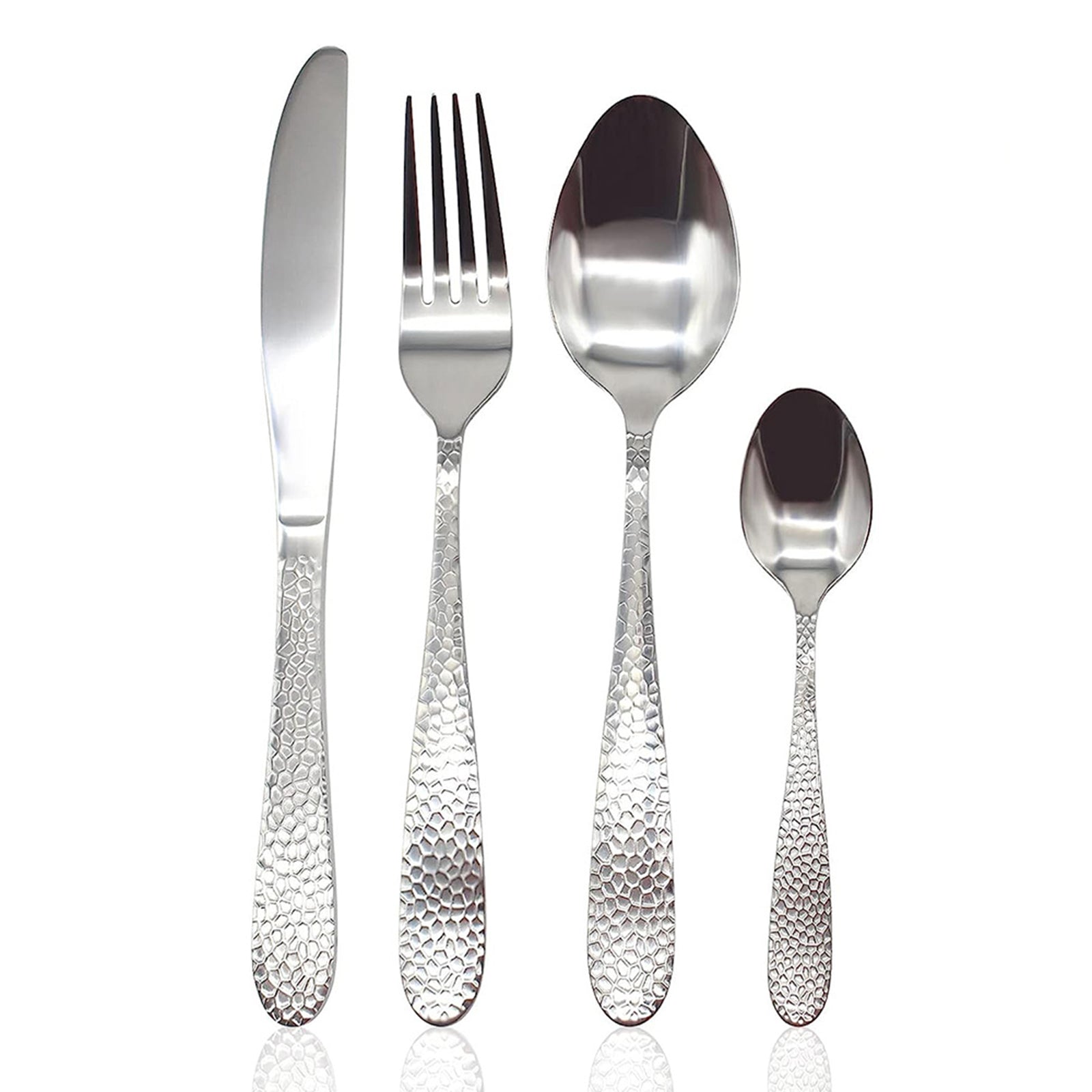 Stainless steel mixed cutlery set with hammered effect handle are made from durable 18/0 stainless steel, the cutlery set is ideal for christmas, wedding and the event party. Colours: silver 32 piece cutlery set: 8 x knives, 8 x forks, 8 x spoons and 8 x tea spoons. (serves for 8 people) hand washing recommended, dishwasher safe. Loose pieces in colour box