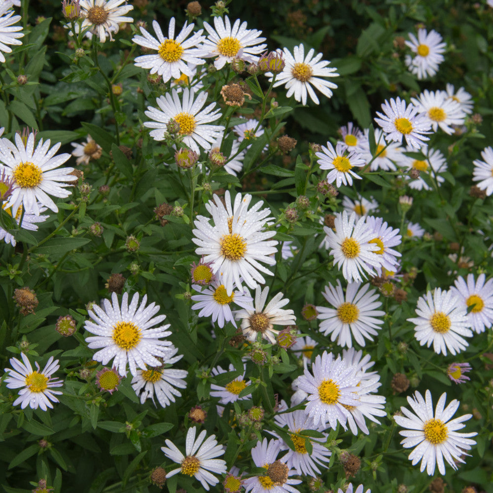 A japanese aster with sprays of small daisy-like flower heads with white petals and golden yellow centers. They sit above tall leafy stems, creaing an upright clump forming perennial. An incredibly hardy plant that loves full sunshine. Perfect for borders, beds and containers and can even be used as cut flowers.