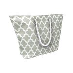 This polyester cooler bag has a moroccan design motif. It features foil lining for insulation and temperature regulation. Standing at 44cm in height and 40cm in width, with a length of 19cm, the bag provides a spacious single main compartment. Carry and rope handles are incorporated for comfortable transportation. Access is granted through a zip fastening running across the top of the bag. Overall, this is a durable and attractively decorated cooler bag well-suited for picnics or day trips.