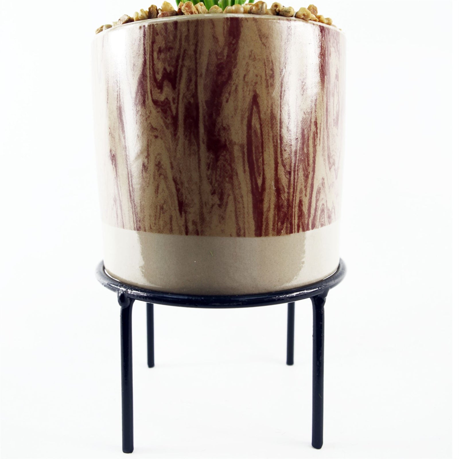 Plastic artificial grass in a decorative ceramic planter- ready to display straight out of the box. This comes with a separate small metal stand that the planter can sit on top of. As arranged in our photos it measures 35cm x 24cm x 24cm. The decorative ceramic planter measures 10cm (h) x 12cm (w). The metal stand is 7cm tall. The leaves are plastic. The ceramic decorative planter is topped with fixed pebbles for an attractive- low maintenance finish.
