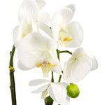 Realistic artificial orchid plant with real touch leaves, glued fixed gravel base, potted in a plastic decorative pot as shown. 7 real touch flowers. Pot is plastic and measures 9cm (h) x 10cm (w) overall height as arranged in our photos 46cm. Stems are wired and this plant can be arranged to your requirements.