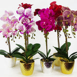 Realistic artificial orchid plant with real touch leaves, glued fixed gravel base, potted in a plastic decorative pot as shown. 10 real touch flowers. Pot is plastic in a golden honeycomb design and measures 10cm (h) x 12cm (w) overall height as arranged in our photos 50cm. Stems are wired and this plant can be arranged to your requirements.