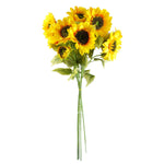 Pack of 6 x yellow sunflower artificial flowers. Can be used to make arrangements with our other artificial flowers or as decorations on their own. Each stem measures 88cm overall height x 28cm wide x 16 deep. There are three sunflower heads. The stems are wired so these can be shaped and bent to arrange. These are easy to cut down shorter using a pair of wire cutters if required. Some of our photos show vases to give an idea of size and possibilities for arrangement but no vases or planters are included with these flowers.