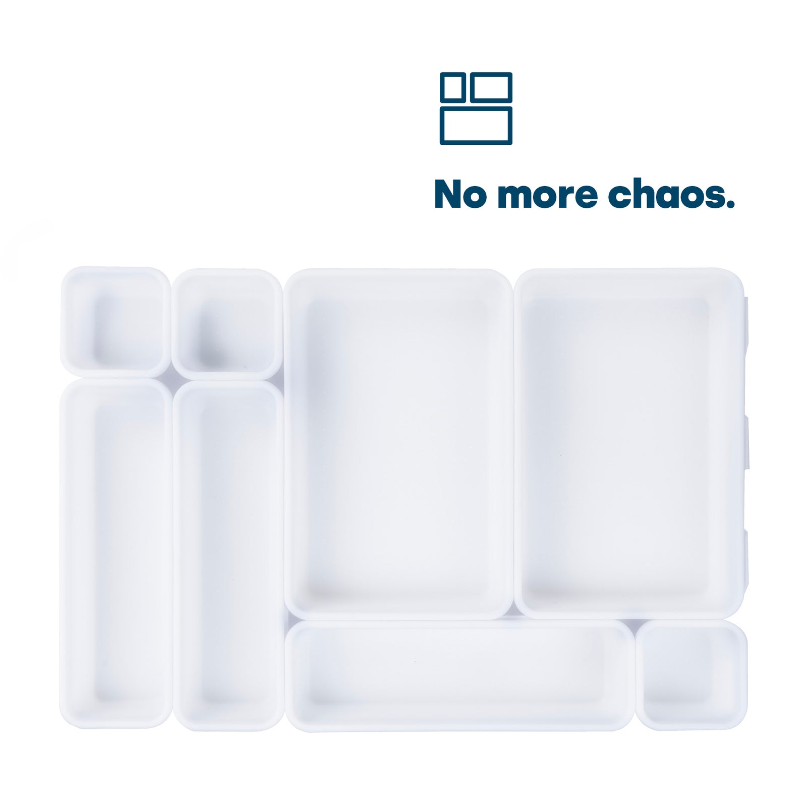 Keep drawers neat and tidy with the 8 interlocking organisers in a range of different sizes. Great for keeping kitchen drawers, fridges, or freezers tidy, use them on their own or add more as you need them.