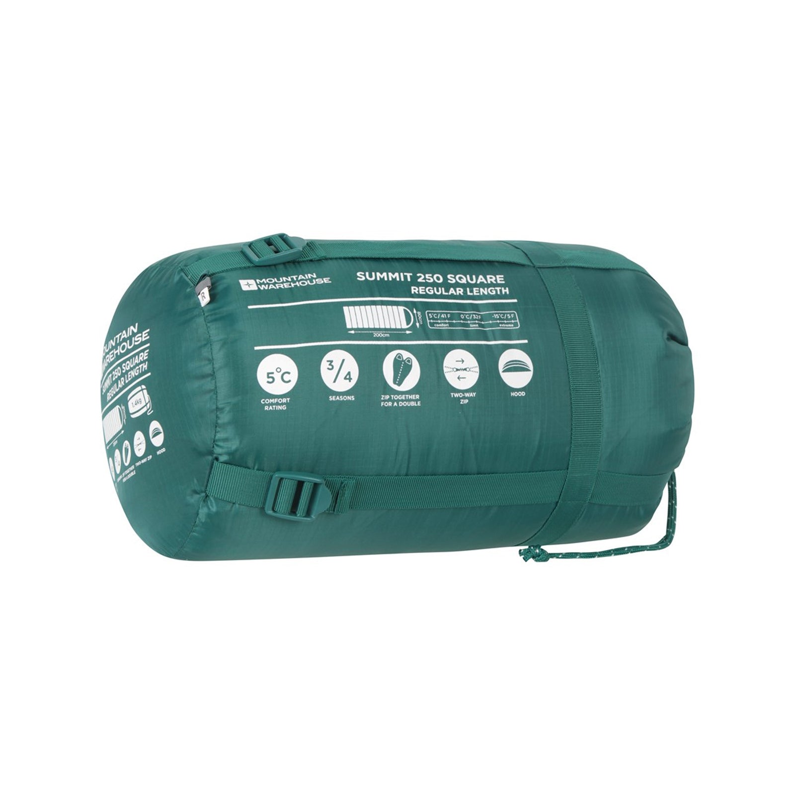 100% polyester. Length: 200cm. Width: 180cm. 125gsm. Contents: 1 drawstring bag. -17c extreme temperature, -1c to 4c comfort temperature, 3/4 season, can be used to create a double sleeping bag. Fastening: adjustable buckle, two way zip. Design: contrast, logo, square. Filling: hollow fibre. Fabric technology: insulating. Fabric: ripstop.