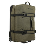 This description is for a 100% polyester travel bag. It measures approximately 73cm in length and 40cm in width. The fabric has been treated for durability and can block rfid signals. The bag features a four wheel design for easy manoeuvrability. It has four compression straps to securely tighten the contents and a grab handle for transportation. An internal packing strap is included to organise items within. The bag has a split-level design with one main compartment. For additional storage, there are internal mesh pockets and a zippered pocket. The carrying capacity is 100 litres. From the top opening to the base, the bag measures approximately 25.5cm in depth. It closes securely with a zip fastening around the perimeter. Simple logo designs or plain styling are available depending on preference.
