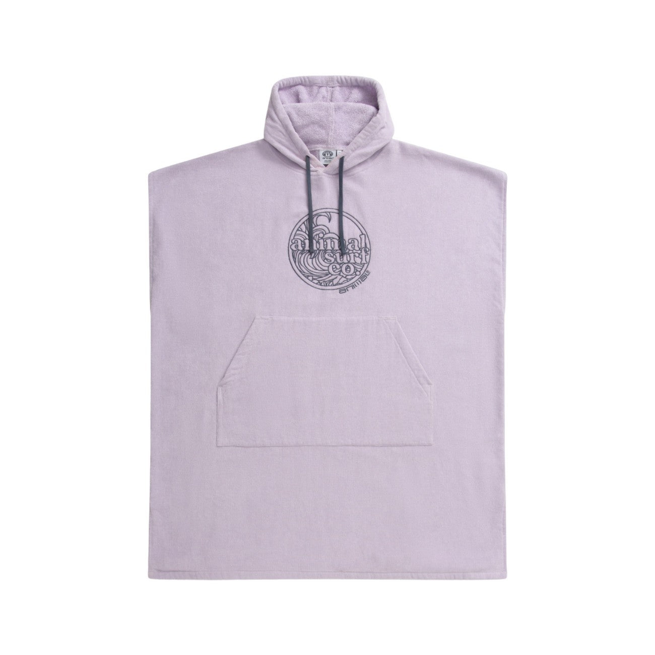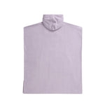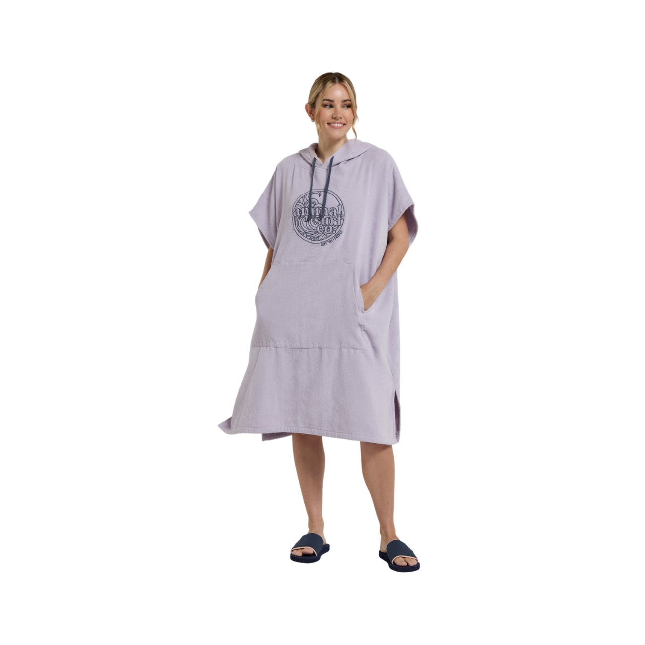 This product description covers a hooded towel designed for women. The towel is made from 100% organic cotton which gives it a soft feel. It has side slits and features an adjustable drawcord hood that is built into the fabric rather than attached separately. There is also a single kangaroo pocket on the front. The towel displays the brand's logo design. Overall, this ladies' hooded towel uses organic cotton fabric that will feel gentle against the skin whilst its practical features such as the integrated hood and pocket provide convenience.