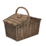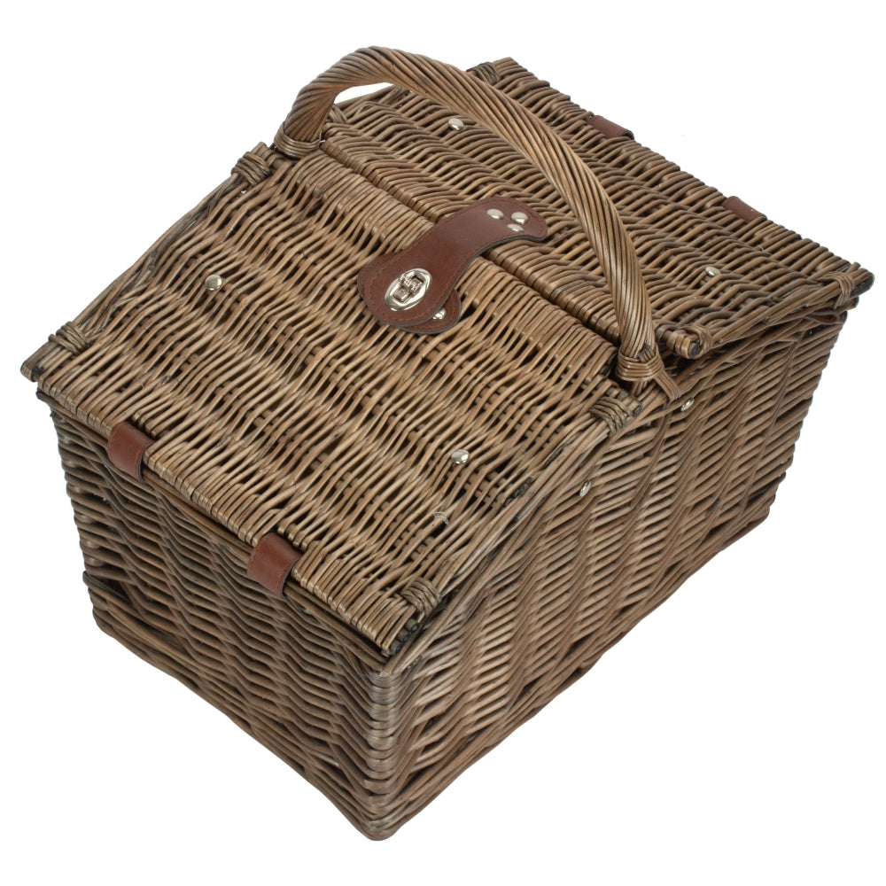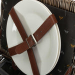 Nature pattern butterfly lidded fitted picnic wicker basket is the perfect companion for any outdoor adventure. This highly fitted wicker picnic hamper is finished in full antique wash willow and faux tan leather, giving it a classic and elegant look.