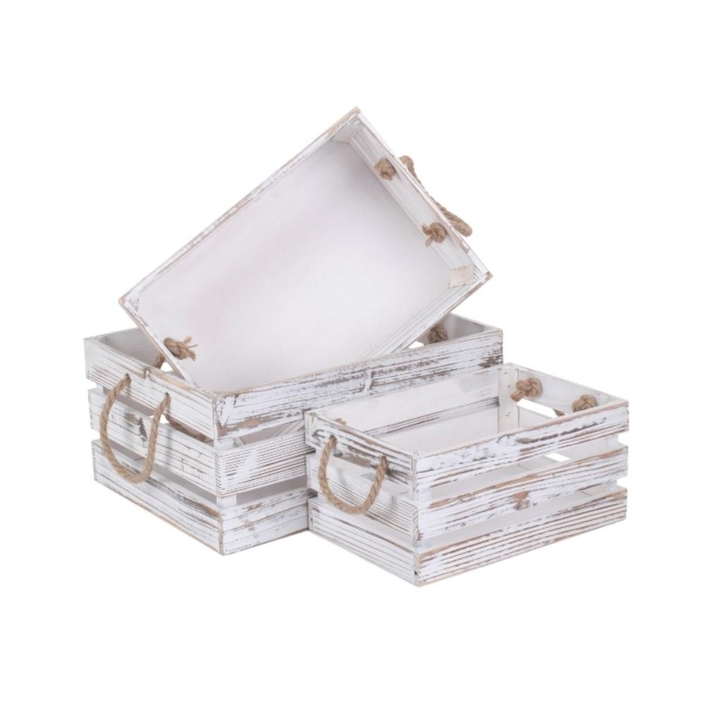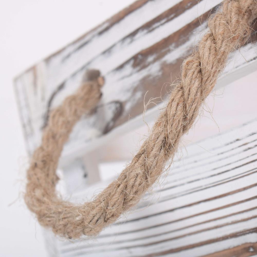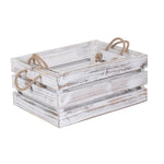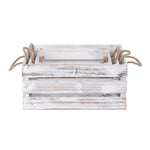 Distressed white rope handled wooden crate is a charming and versatile storage solution for any home. Crafted from soft wood and finished in a distressed white wash, this wooden storage box exudes a rustic and vintage appeal. The addition of rope handles adds a touch of nautical flair, making it both functional and stylish.