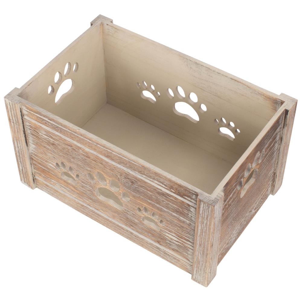 Keep your furry friend's toys organized and easily accessible with this charming dog toy storage box. Crafted from soft wood, this wooden storage box features a distressed pine finish with adorable paw cut outs, making it not only functional but also a stylish addition to any room in your home.