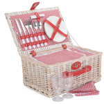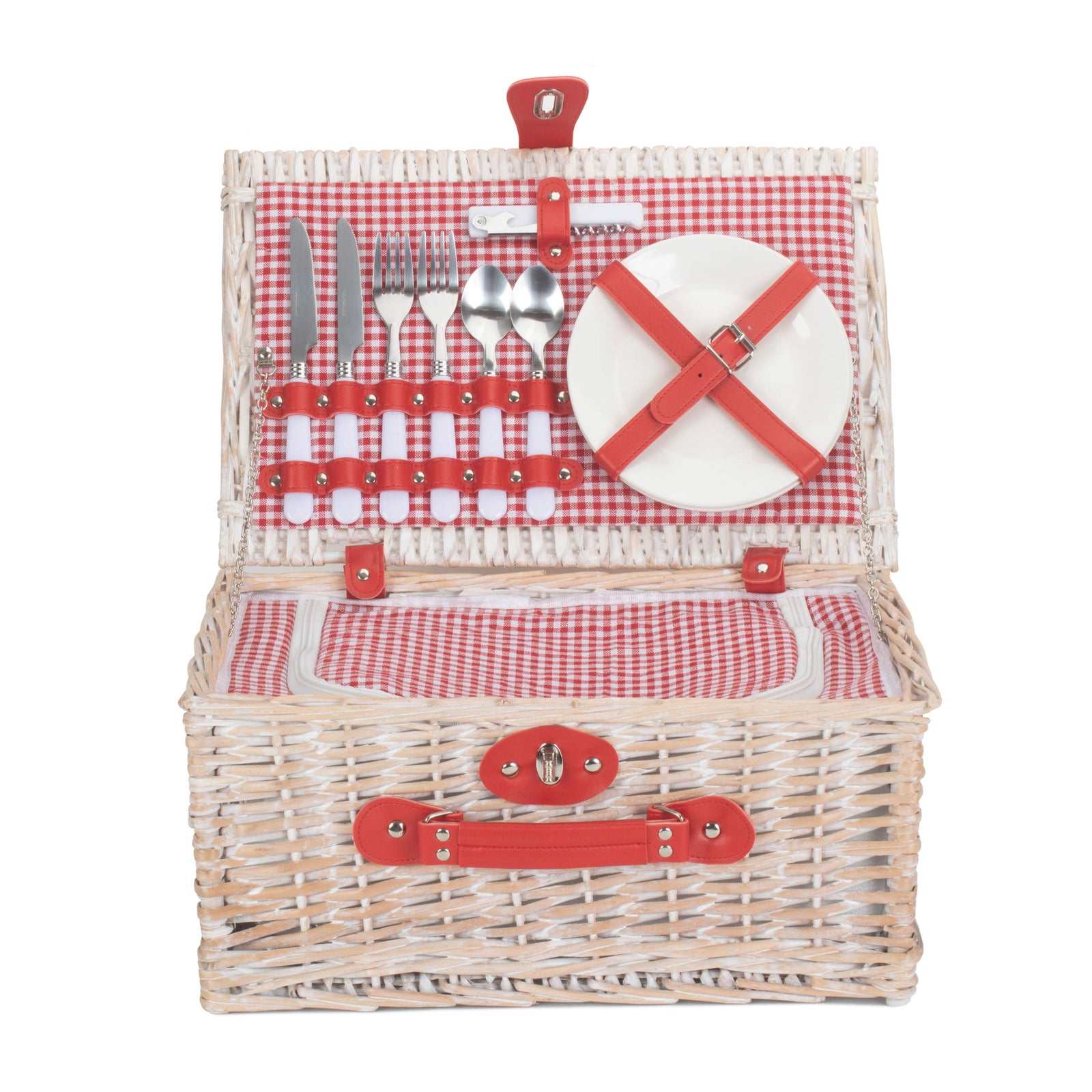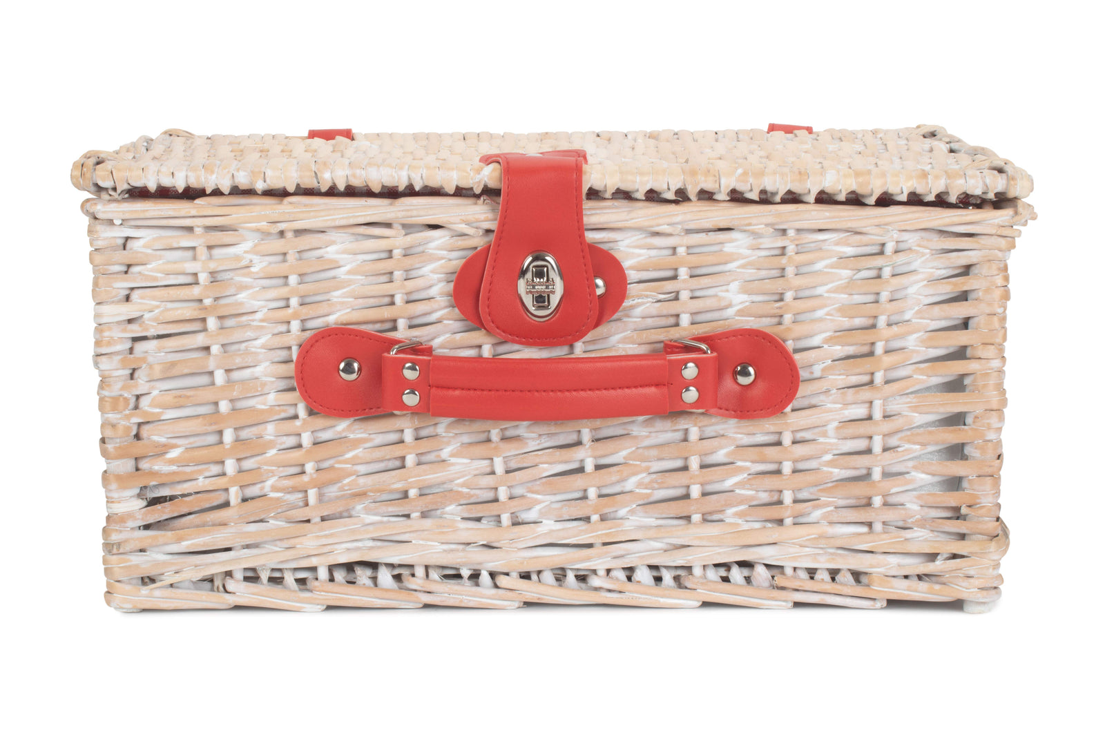 2 person fitted picnic wicker basket is the perfect accessory for a romantic picnic for two. This highly fitted wicker picnic hamper features a split white wash finish willow design with faux red leather straps, giving it a classic and elegant look.