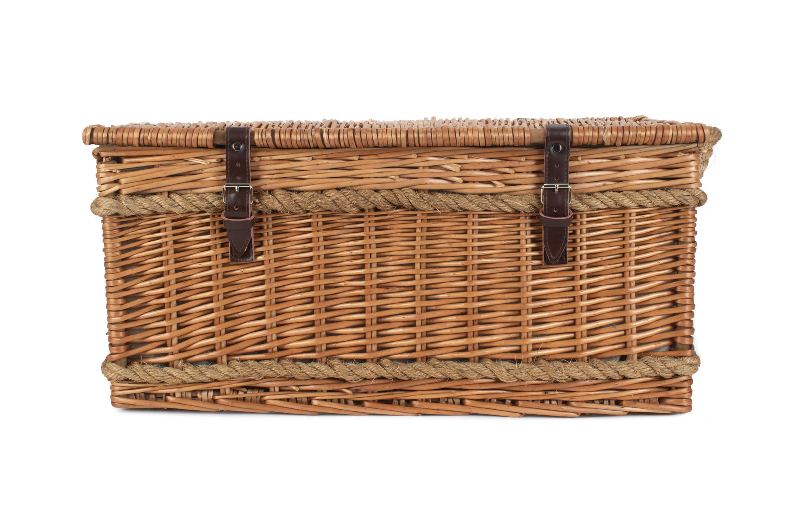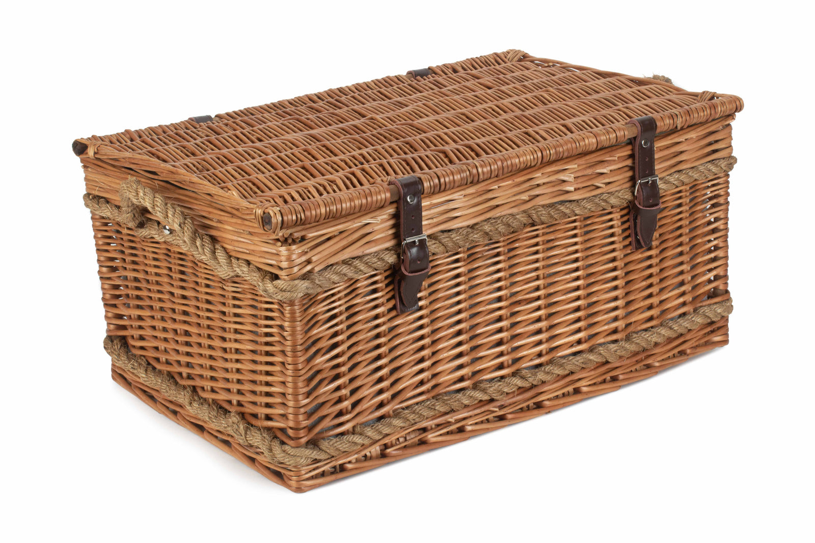Rope handled green tweed 6 person fitted picnic wicker basket is the ultimate picnic accessory for those who appreciate both style and functionality. This highly fitted wicker picnic hamper is finished in full buff willow with rope handles and real dark leather straps, giving it a classic and sophisticated look.