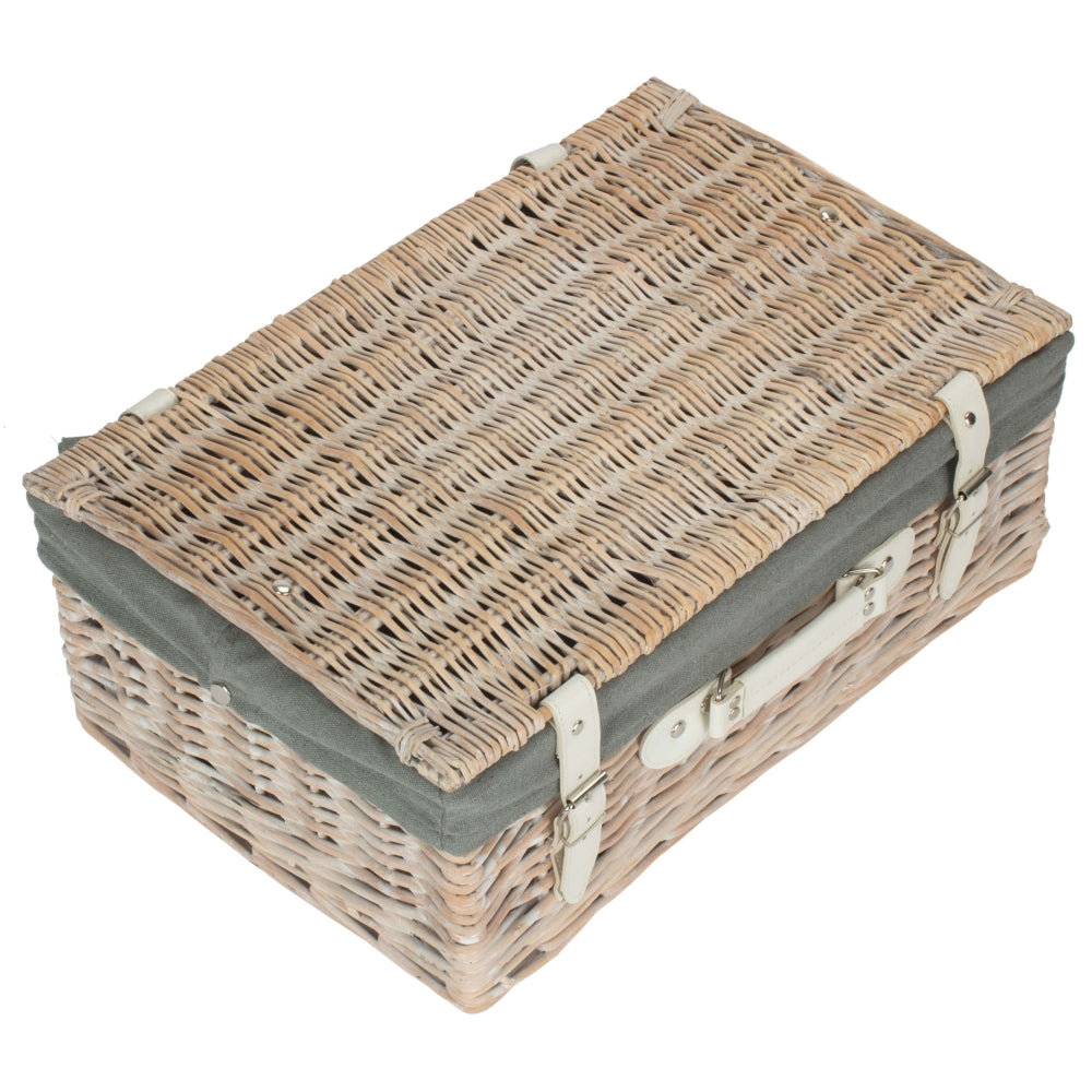 crafted from full willow with a stunning white wash finish, this picnic basket features white faux leather hinges and straps, as well as metal chains for added durability. The option to include a removable cotton lining adds a touch of practicality to this already attractive piece.