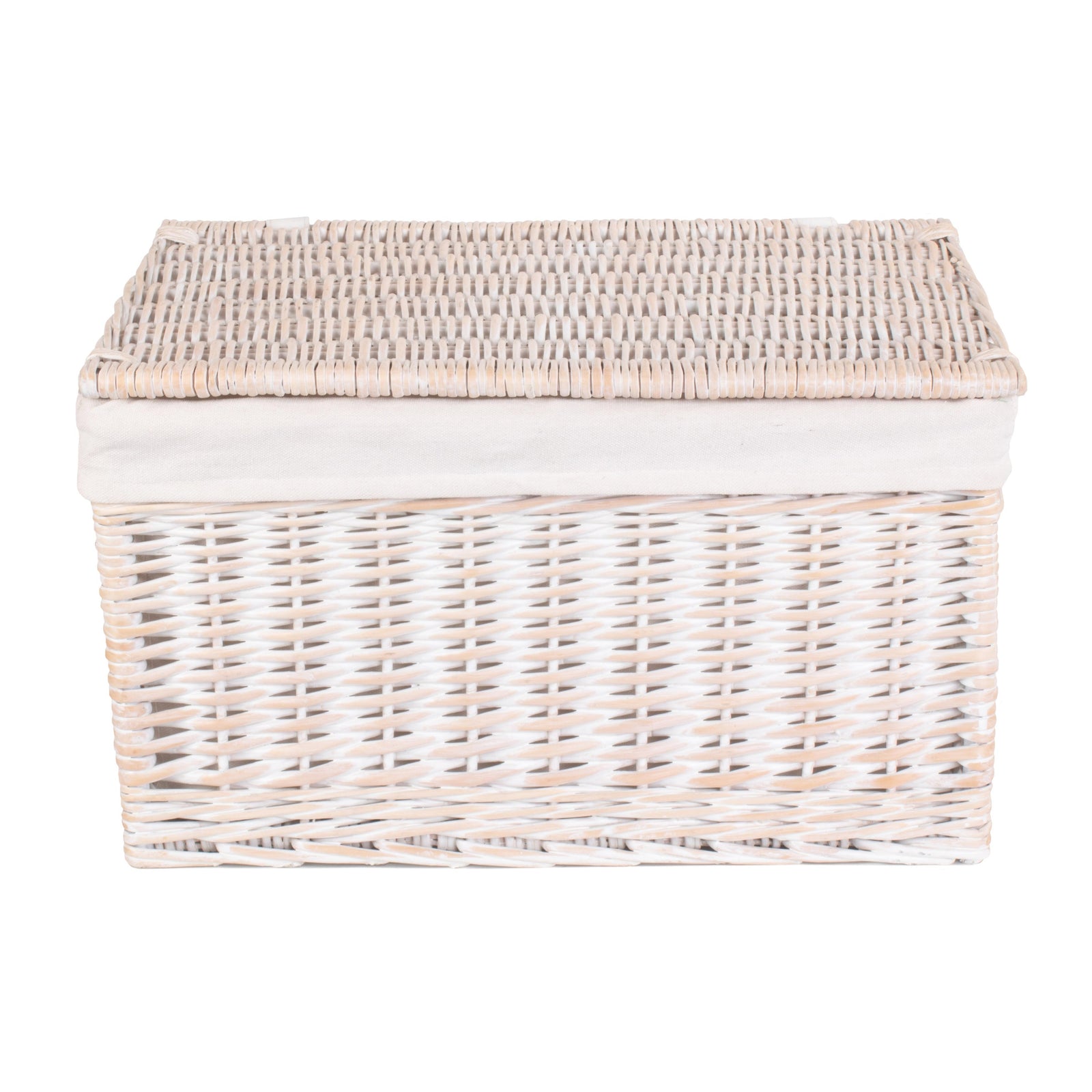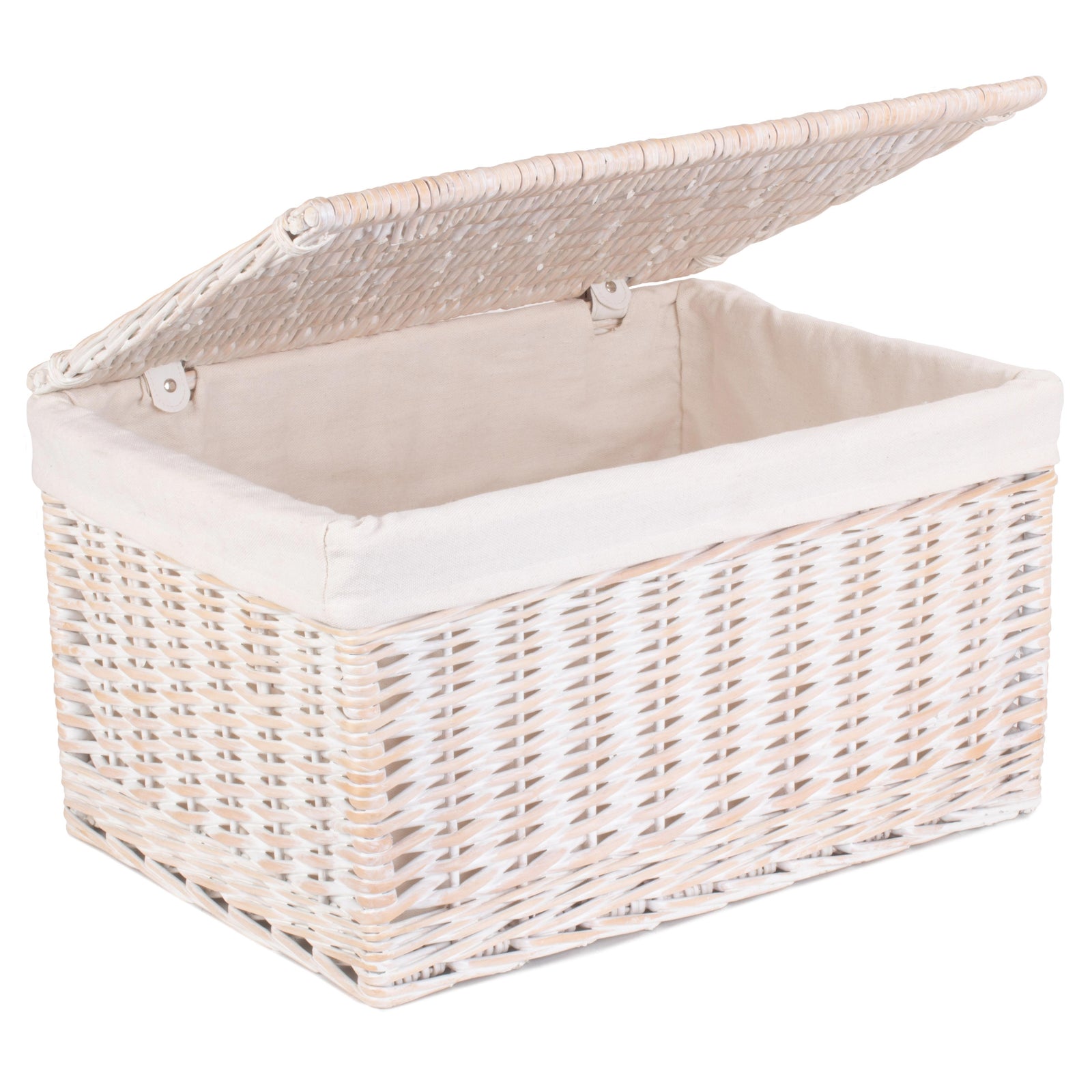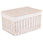 finished in a delicate white wash willow, this storage basket is adorned with faux cream leather hinges that add a touch of elegance to its design. The removable cotton lining ensures that your belongings are stored safely and securely, while also adding a soft and luxurious touch.