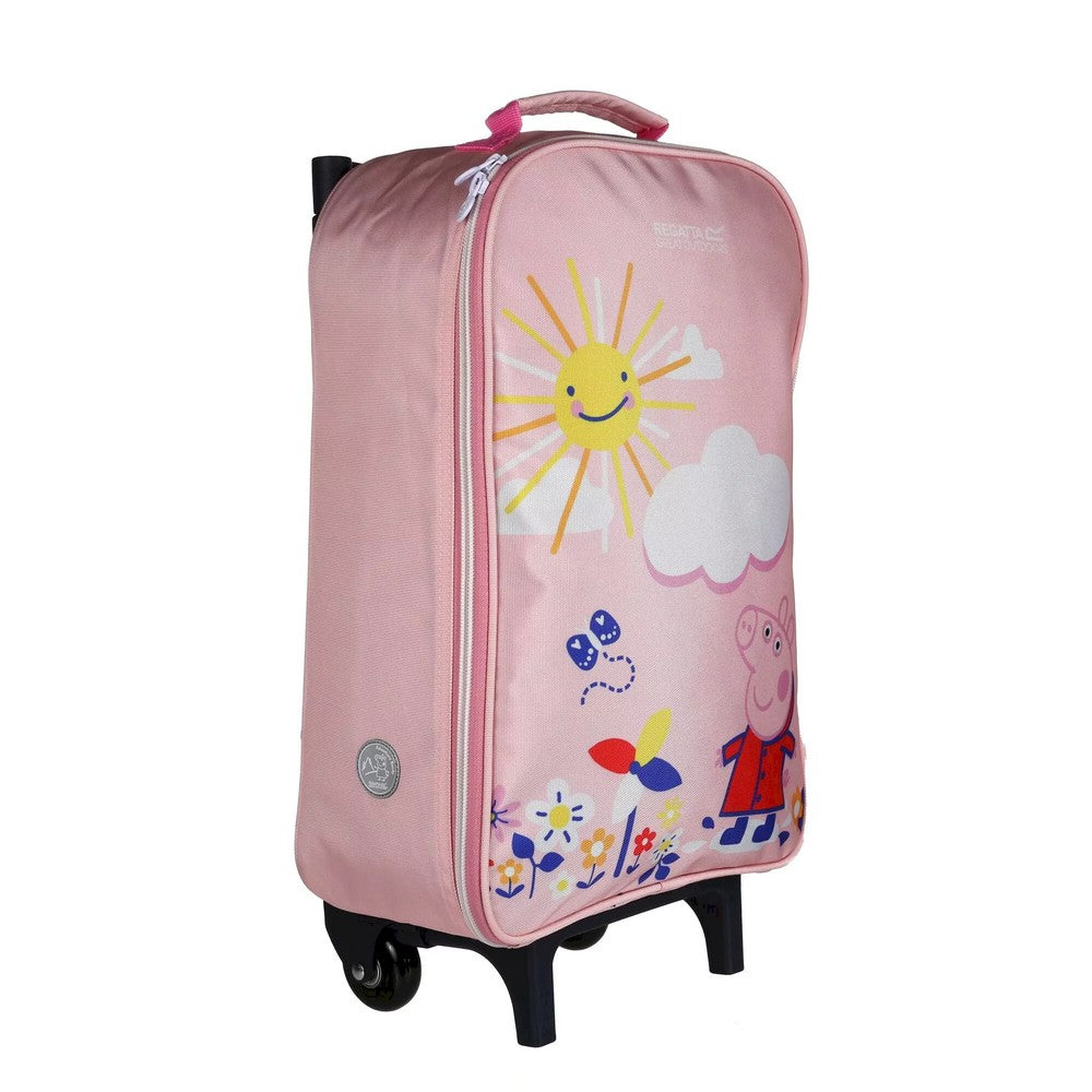 100% polyester. Length: 40cm. Width: 28cm. Depth: 12cm. Handle features: telescopic. Carry handle, durable wheels, hardwearing feet, padded, retractable handle. Fastening: two way zip. Design: clouds, flowers, logo, sun. Compartments: 1 main compartment. Pockets: mesh pocket, internal, stow pocket. Capacity: 12l. 100% officially licensed. Hardwearing. Characters: peppa pig.