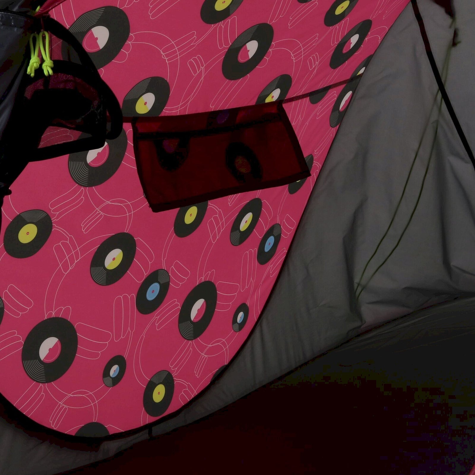 100% polyester. Fire retardant. Hydrostatic head: 3000mm flysheet. Denier: 70d. Bright guy lines, fibreglass poles, insectproof mesh, lantern hanging points, mesh door, multiple internal pockets, multiple vents. Fabric technology: hardwearing, waterproof. Design: logo, printed, vinyl record.