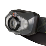 This head torch is the montegra 250. It has a compact three-way design with four light settings including an auto-dimming function. The lighting technology uses cree leds to provide 250 lumens of brightness. Powered by a single aaa battery, the head torch features adjustable fastening straps to securely attach it to the user's head. The materials used in construction are 50% abs plastic, 35% acrylic and 15% thermoplastic elastomer.