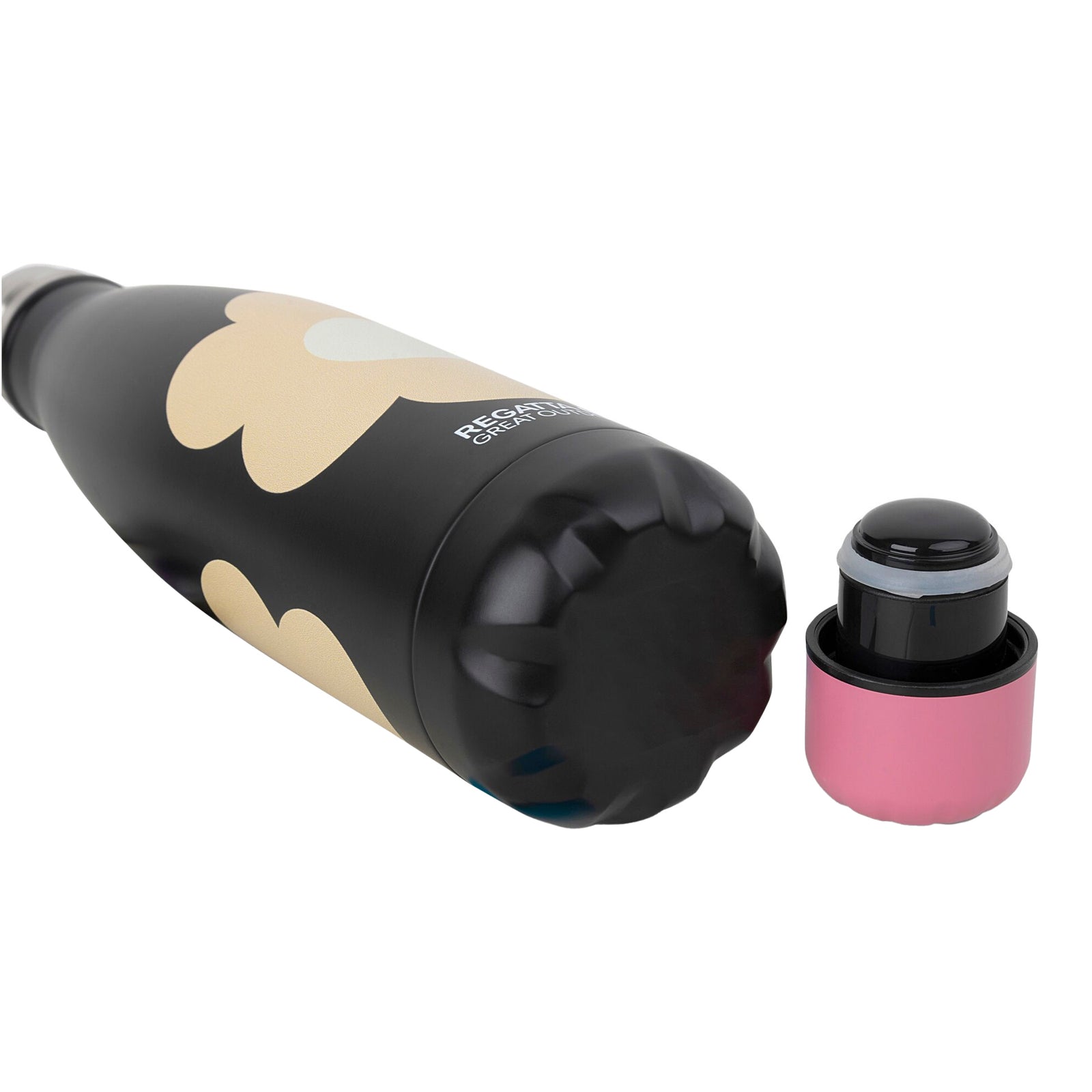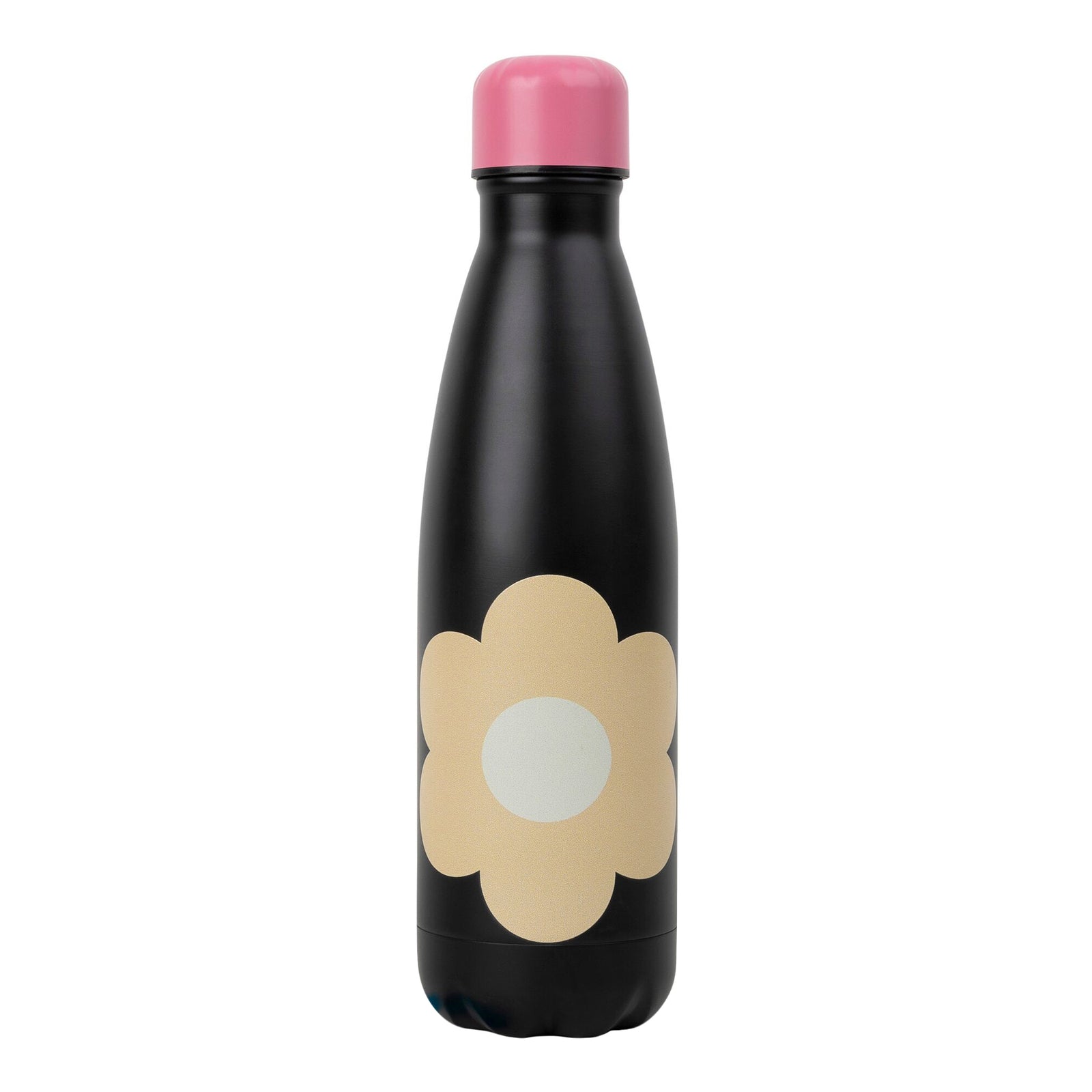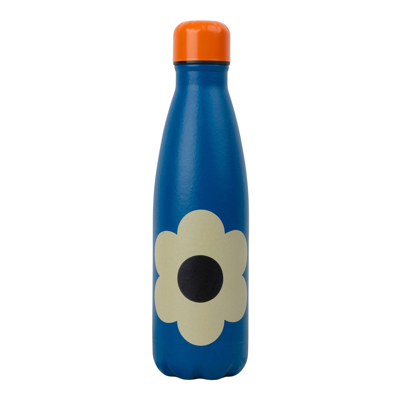 This product description provides details of an orla kiely branded water bottle. The bottle is made from durable stainless steel which makes it lightweight yet able to retain heat or coolth as needed. It has an appealing daisy flower design with the orla kiely logo prominently displayed. The double walled, insulated bottle contains a screw top lid for easy opening and closing. With a capacity of 0. 5 litres, this water bottle is conveniently sized for on-the-go hydration.