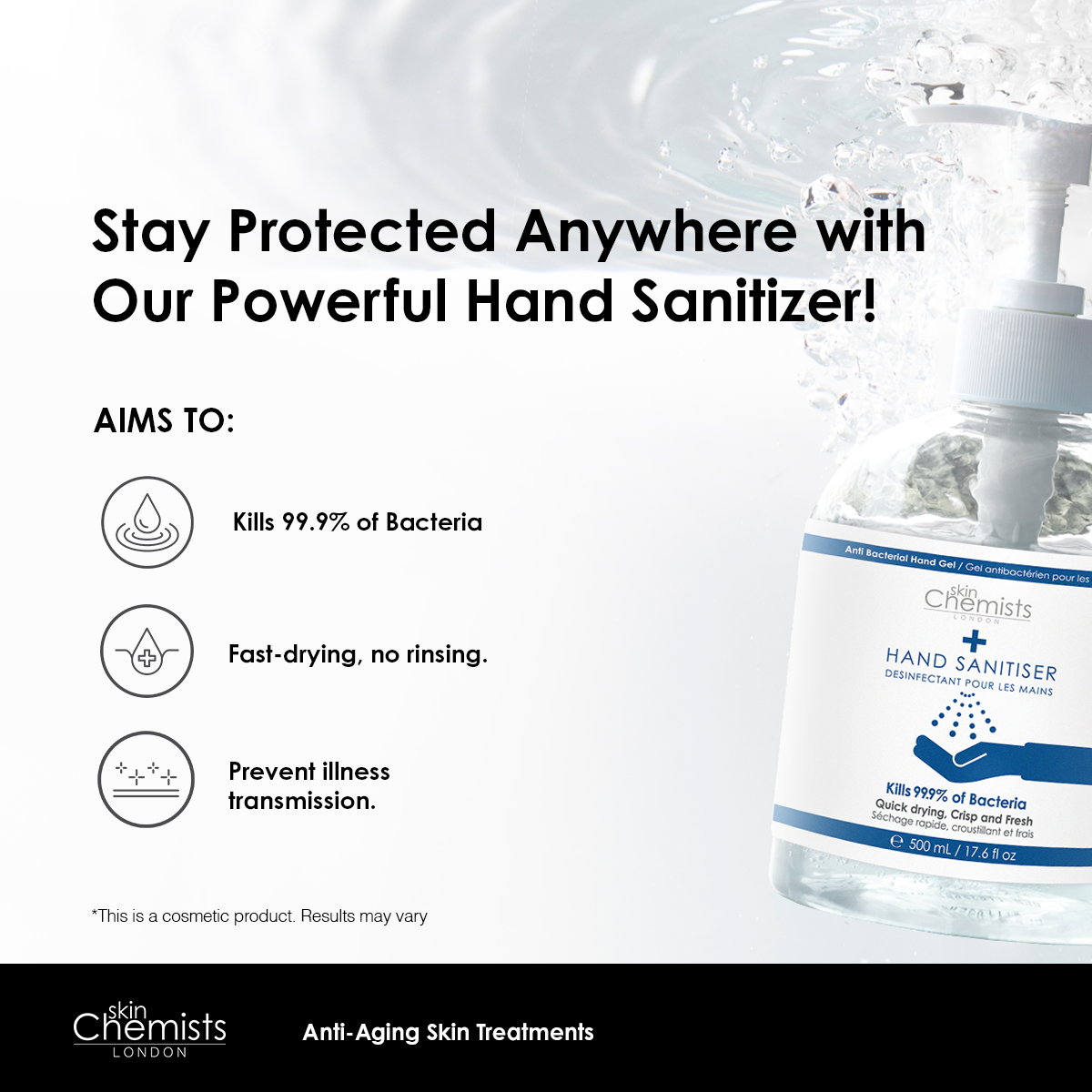 Skinchemists hand sanitiser is a 500ml product that contains 70% alcohol denat, glycerine, and other ingredients. This formula focuses on cleanliness and hygiene, making it an essential product for keeping hands germ-free and protected.