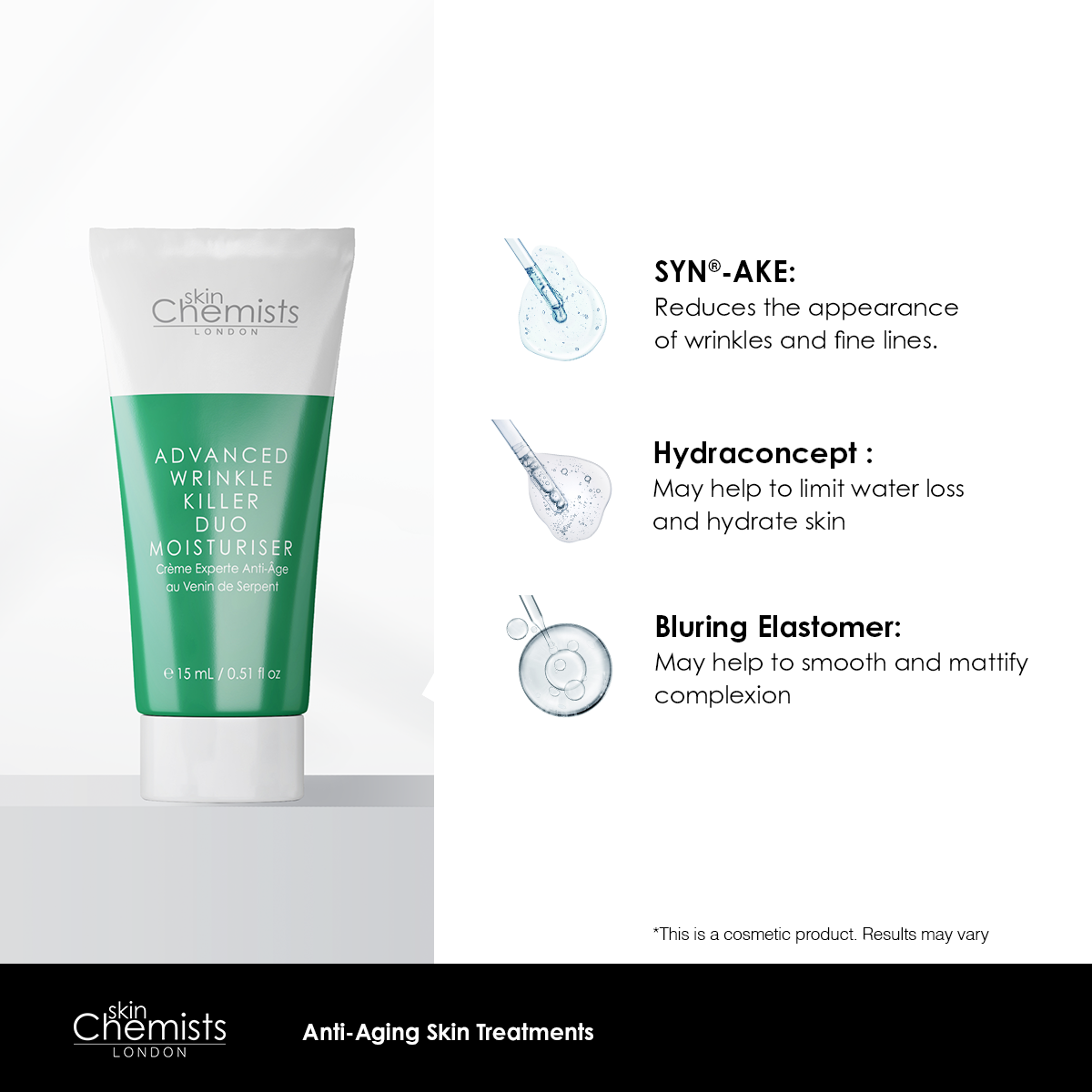 Our wrinkle killer duo moisturizer is a powerful formula that keeps your skin smooth, firm, and hydrated. With the key ingredient 'syn-ake', it effectively reduces fine lines and wrinkles, giving you a youthful-looking complexion. This moisturizer also provides antioxidant protection, ensuring your skin stays healthy and radiant.