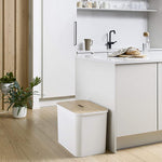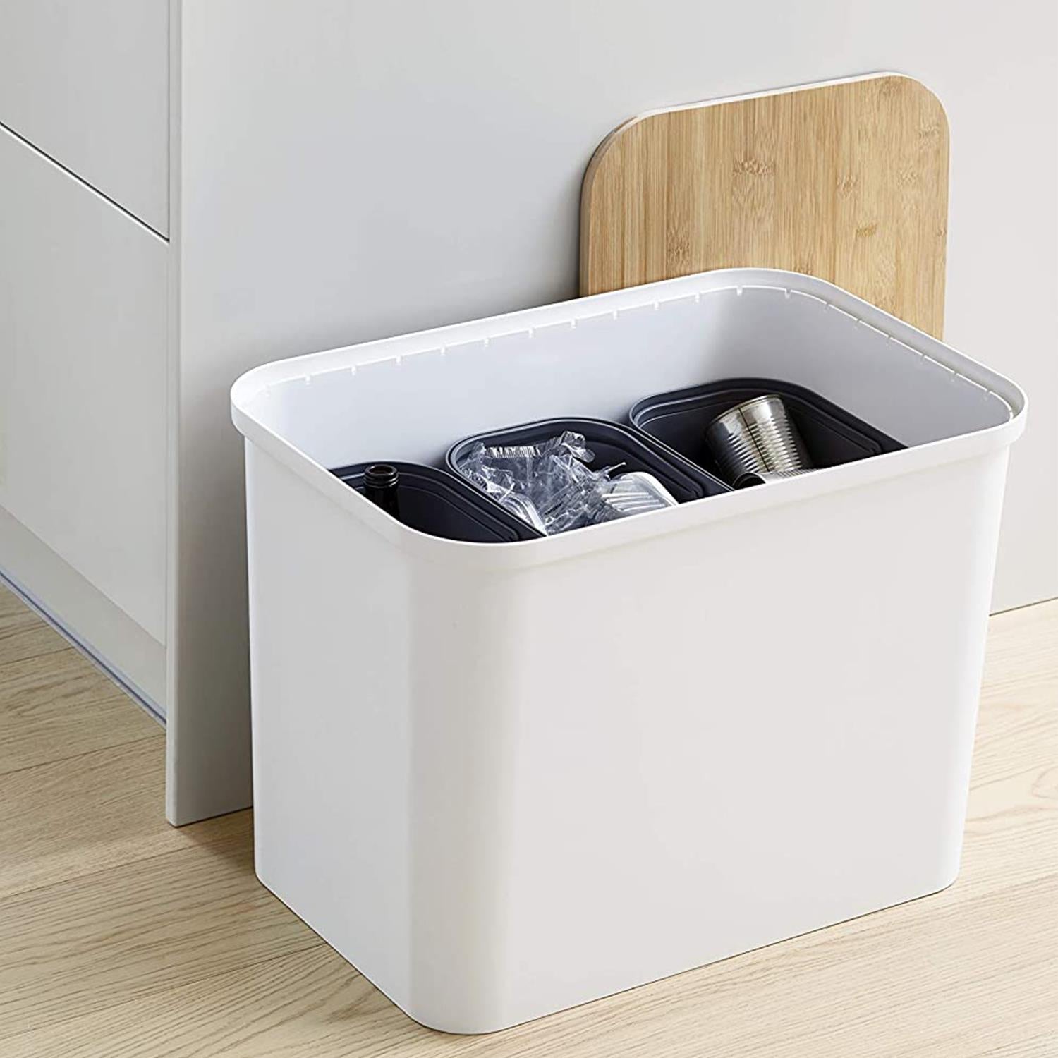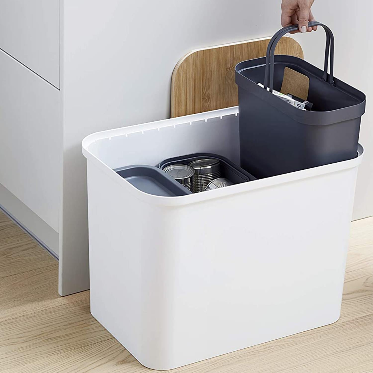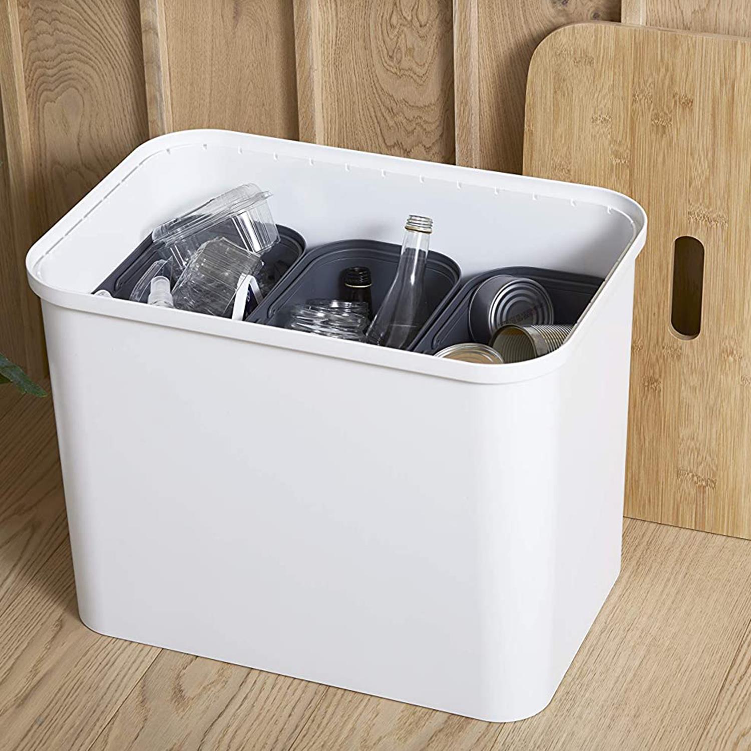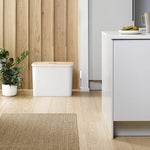 Smartstore collect is a storage solution for sustainable living. The concept is designed to make sorting and recycling easy and integrated into everyday life. The set contains 1x collect 76 l white; 1x collect 76 l plywood lid; 3x collect 13 l taupe; and 1x collect 13 l lid taupe.