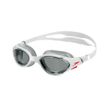 This product description is for unisex adult biofuse swimming goggles with a polycarbonate lens. The key features include a grooved design with a logo, a biofuse construction, a low-profile silicone head strap, push button adjustment, and traction gears. The lenses provide uv400 protection and are anti-fog coated. The flexible frame has an increased field of vision thanks to its peripheral design. The soft seal frame and sturdy inner frame combine with the low-profile head strap to offer a comfortable yet secure fit when swimming.