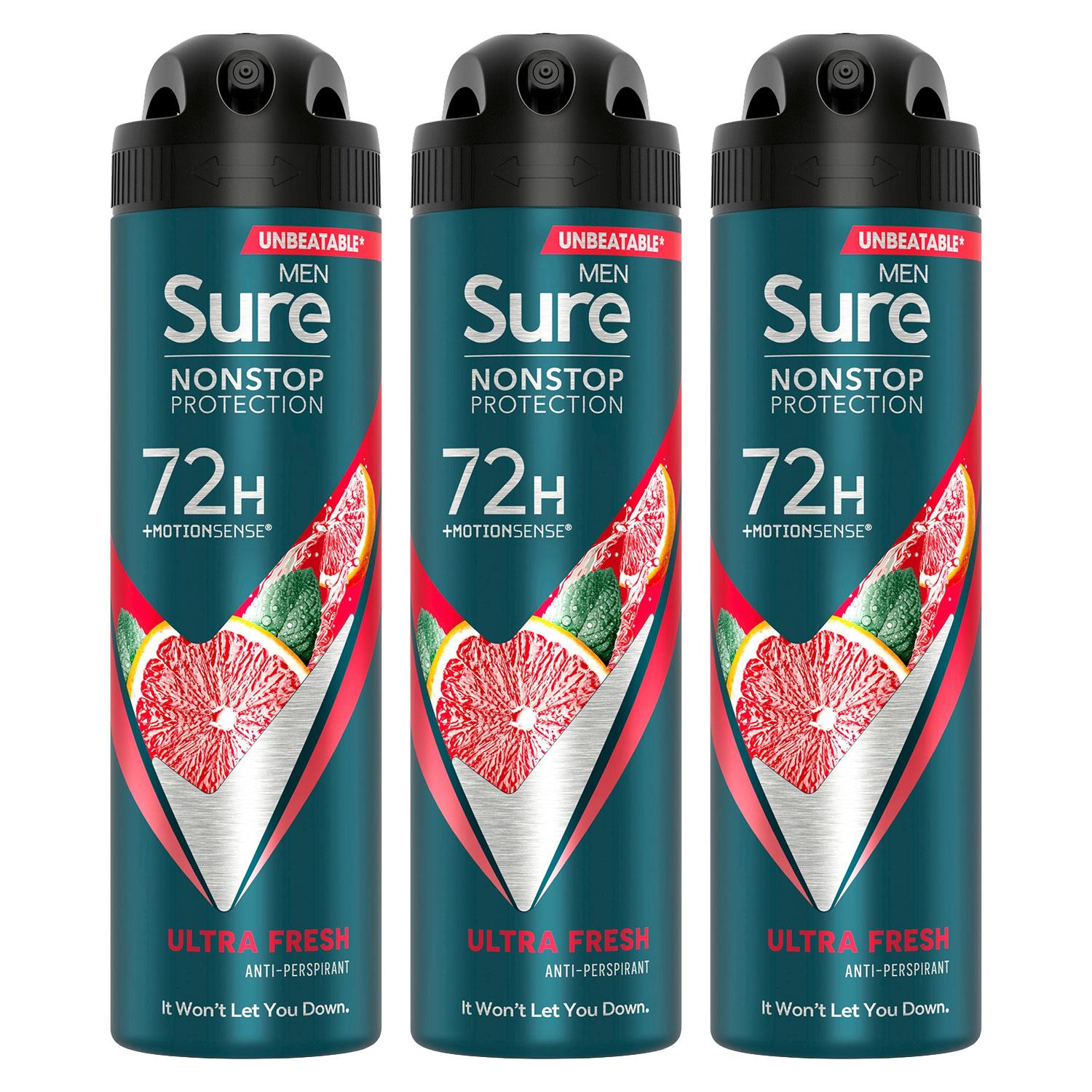 Sure men ultra fresh nonstop protection anti-perspirant deodorant aerosol, from the uk's no.1 anti-perspirant brand, is the first anti-perspirant to provide 72-hour non-stop protection against sweat and odour. The unbeatable anti-sweat microtechnology provides 2x more powerful protection, so you're always ready for whatever your day throws. It also contains sure�s innovative motionsense technology. It works like this: unique microcapsules sit on the surface of your skin. When you move, friction breaks those microcapsules, and they release more fragrance. Every time you move, motionsense keeps you fresh and free from odour.