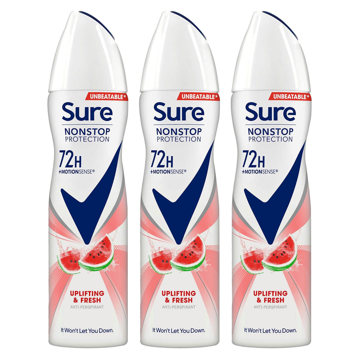 Sure uplifting & fresh nonstop protection anti-perspirant deodorant aerosol, from the uk's no.1 anti-perspirant brand, is the first anti-perspirant to provide 72-hour non-stop protection against sweat and odour. The alcohol-free formula helps you feel fresh, dry and protected all day without irritation. The unbeatable anti-sweat microtechnology provides 2x more powerful protection, so you're always ready for whatever your day throws. Our innovative motionsense technology releases bursts of uplifting fragrance when you need it most. It works like this: unique microcapsules sit on the surface of your skin. When you move, friction breaks those microcapsules releasing more fragrance. So, the more you move, the more it protects.
