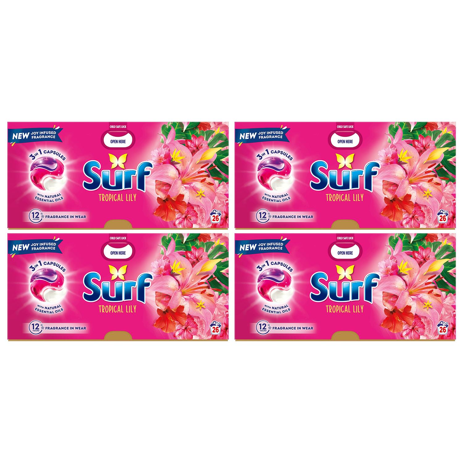box contains: surf 3 in 1 laundry washing detergent capsules tropical lily, 104 washes