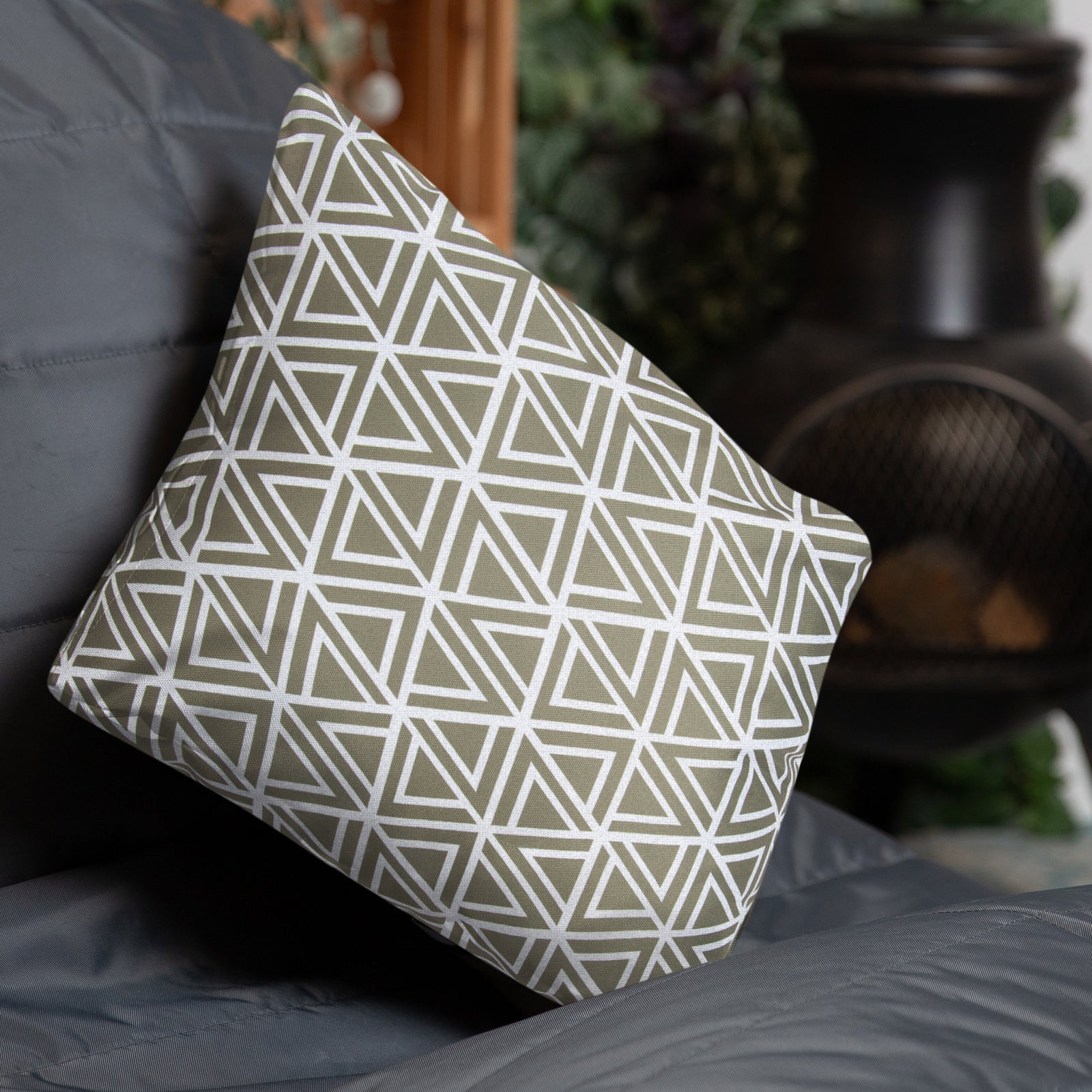Geometric print outdoor cushiongeometric print cushion - olivecreate an inviting outdoor living space with this graphic printed cushion. Its scandi-chic design will make a strong statement in your home or garden. Filled with a plump hollow fibre, this comfortable geometric inspired cushion is perfect for adding a decorative touch to your outdoor furniture. Ideal for indoor and outdoor use, this patterned cushion is designed with 100 percent percent waterproof fabrics. Extend its life by simply wiping clean any spillages and storing them in a cool, dry place indoors. Ready to bring outside when the warmer weather arrives on fresh spring and bright summer days.soft and cosyindoor and outdoor cushionzip closurecushion cover and filling includedfibre filled square cushionpractical and on-trendvibrant geometric designhigh quality, water resistant fabric
