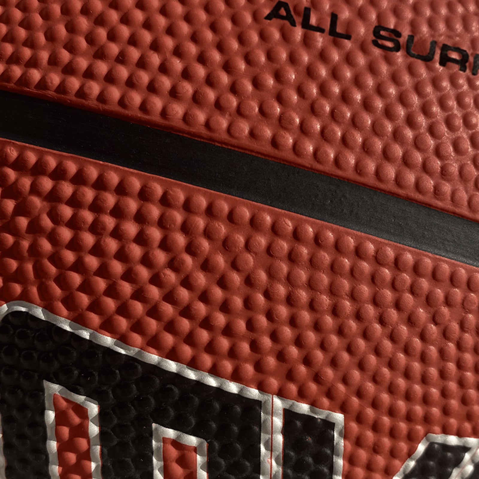 This basketball has been designed and manufactured to be both durable and provide a reliable grip. It is constructed from rubber, a material well-suited to withstand the rigours of play, and features an official logo and text design. Wide channels are embossed onto the surface to ensure security when handling the ball, while its high-grip texture reduces the risk of slippage during shooting and dribbling motions. This professionally licenced sports equipment meets regulation standards for competitive play.